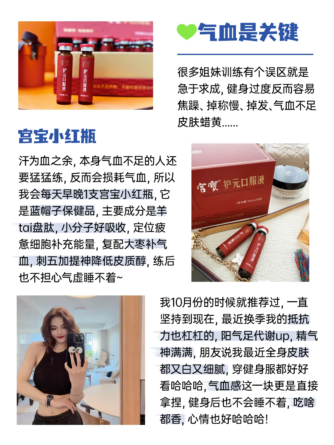 我会每天早晚1支宫宝小红瓶,主要成分是羊tai盘肽,小分子好吸收复配大枣补,刺五加,有天然营养补充后,练后也不担心~