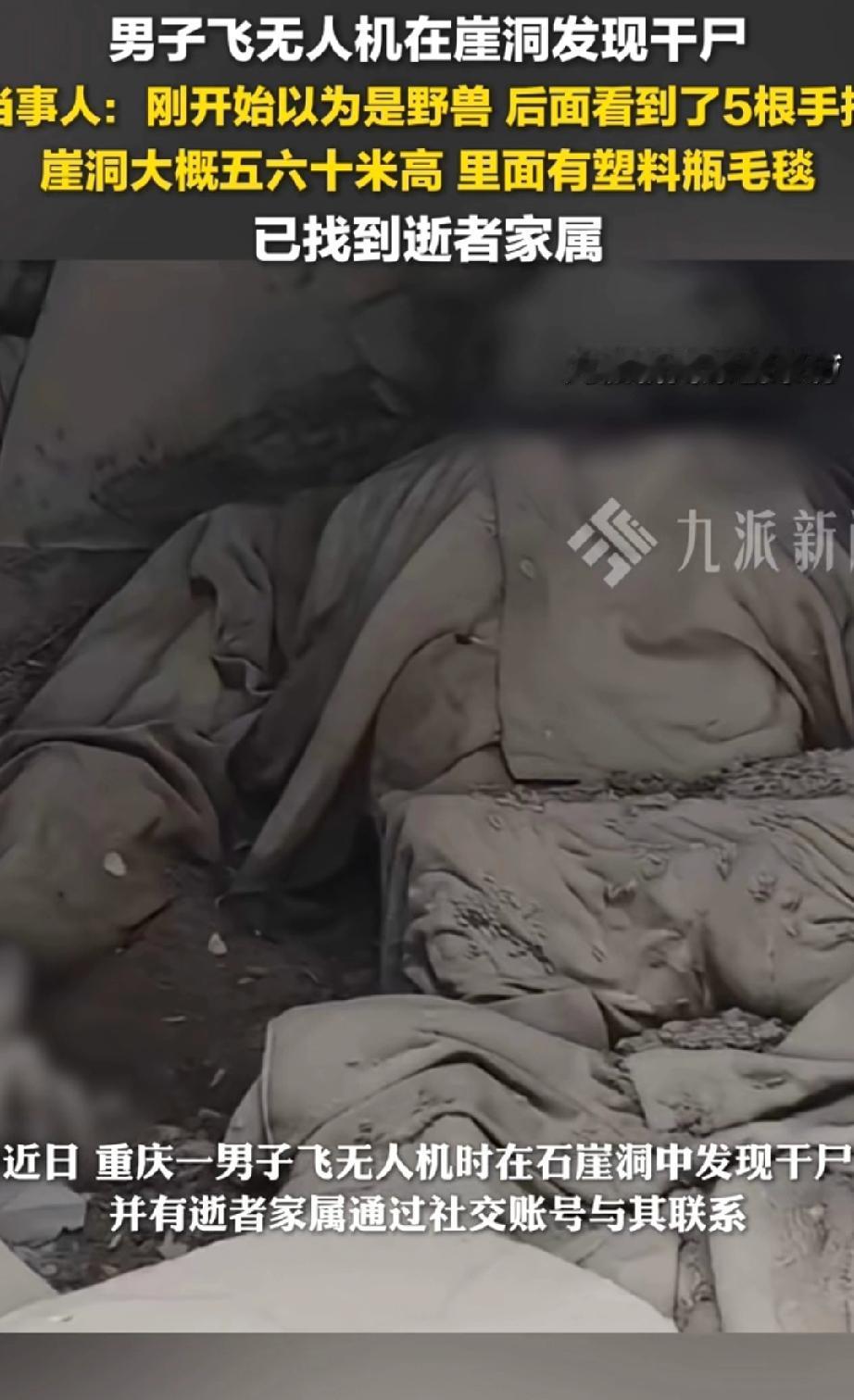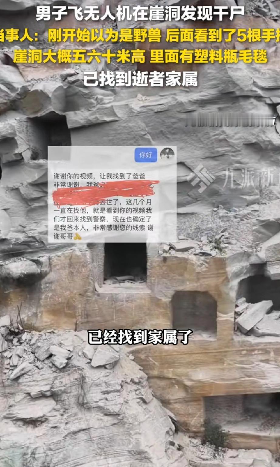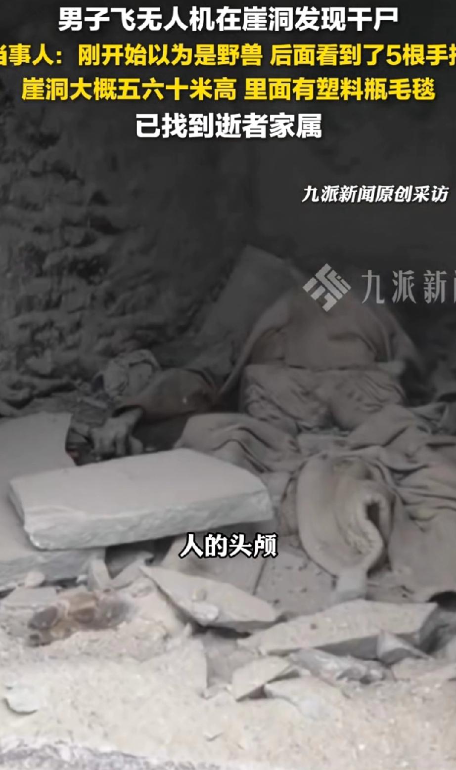 四川,一名男子在山里训练无人机时,发现崖壁上的石洞里似有一头死亡的野兽。他定睛细看,竟觉得那好像是个人,能看到头颅和手指。 洞里还有毛毯和水瓶,男子又仔细端详一番,确认看到的是一具干尸,顿时吓得心惊肉跳,颤抖着赶忙报警。 警察半个小时就赶到,勘察了现场,确认死者是一名男士。 事后,男子将视频发布到网上,有网友联系上他,感谢他的发现,称已确认死者正是自己离家数月的父亲。 这个位于崖壁上的石洞,距离地面有五六十米高,且周围有多处石洞,这是老祖宗留下来的吗?记得古代有崖葬的先例。 死者带着毛毯和水壶爬到石洞里,是想在里面清修吗?还是只想寻一段清静时光,却不想突发疾病离世。 若不是无人机发现,估计死者家人一辈子都找不到他了。这或许就是科技时代的好处吧。 来源:九派新闻 野外无人机
