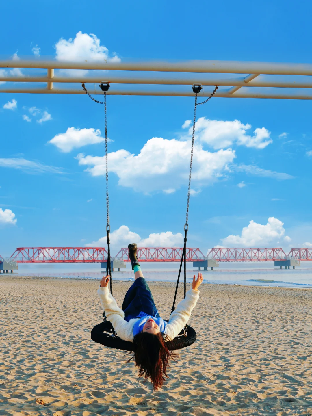 ▪️沙滩秋千:亲测人物背对相机,取红桥🌉和大海🌊沙滩为背景,抬腿压低上半身,也是妥妥的活人感
