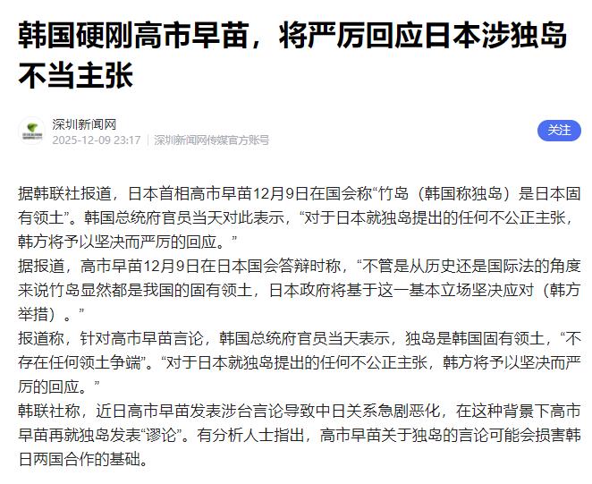 打就打!韩国和日本这次是彻底“撕破脸”了! 据报道,日本首相高市早苗12月9日在国会说“竹岛(韩国叫独岛)是日本的”,韩国总统府当天就硬怼回去:“日本要是敢在独岛问题上胡来,我们肯定跟他硬碰硬。” 了解韩日关系的都知道,独岛就是韩国的底线,谁碰谁挨怼。高市早苗明知道这点还故意挑事,韩国自然不会退让,这背后不只是面子问题,还有历史、利益和民心的考量。 先把话说透,高市早苗这么嚣张,根本不是为了什么领土,就是她一贯的右翼脾气在搞鬼。 她本来就是跟安倍一路的保守派,上台前就靠说强硬话博关注,比如反对女性当天皇、说排外的话。 这次拿独岛说事,说白了就是想讨好国内的右翼势力,巩固自己的地位。 可她没料到,独岛问题在韩国根本没商量的余地,别说她一个首相,整个日本政府来挑事,韩国也敢直接刚,这不是韩国倔,是历史和道理都站在韩国这边。 从历史上看,独岛本来就是韩国的。早在500多年前的新罗时期,独岛就归朝鲜半岛管了,古代韩国的史书里都写得明明白白。 日本直到17世纪才有人偶然发现这个岛,跟韩国的历史记载差远了。后来1905年日本侵略朝鲜半岛,才强行把独岛改名叫“竹岛”抢了过去。 二战后国际条约早就说了,日本得把抢来的土地还回去,独岛也在其中。 1953年朝鲜战争期间,日本想趁乱占岛,被韩国义勇队赶了出去,之后就一直是韩国在管,岛上常年有海警驻守,还有码头、雷达这些设施,这都是实打实的事实。 可能有人觉得,一个才0.18平方公里的小岛,犯不上闹这么僵?其实这小岛是块“聚宝盆”,还是战略要地。 它处在日本海冷暖洋流交汇处,是优质渔场,每年能捕数十万吨鱼,周边200海里的区域都是韩国的专属经济区,面积比两个韩国还大。 海底还有大量石油和可燃冰,对能源全靠进口的韩日来说,这就是命脉。 而且独岛卡在朝鲜半岛和日本之间,是航运关键节点,韩国能在这监控日本的军事动向,战略意义特别重要。 更重要的是,韩国硬刚也是民心所向。在韩国,保卫独岛是全民共识,超过65%的老百姓都支持政府对日强硬。 韩国甚至把2000多人的户口迁到独岛上,就算没人住,也要明明白白告诉全世界“这是我们的”。 说到底,高市早苗的挑事就是一场政治博弈,可她选错了对象。韩国在独岛问题上从没怂过,之前日本不管哪个政客挑事,韩国都会用抗议、暂停合作、加强巡逻这些方式反击。 这次除了口头警告,韩国已经打算搁置和日本的联合搜救训练,后续还可能加强独岛周边的巡逻。 对韩国来说,独岛是红线,谁挑事就怼谁;对高市早苗来说,想用独岛讨好右翼、转移国内矛盾,大概率是搬起石头砸自己的脚。 总结下来,韩国硬刚高市早苗不是一时冲动,是历史、利益、战略和民心的共同选择。 独岛是韩国的固有领土,有充分的依据。日本想抢独岛,就是无视历史、侵犯韩国主权。 高市早苗的挑事只会让韩日关系更紧张,而韩国的强硬回应就是要告诉日本:主权问题没商量,敢挑事就付出代价。这场硬刚,韩国占理、占民心,根本没理由退,也绝不会退。
