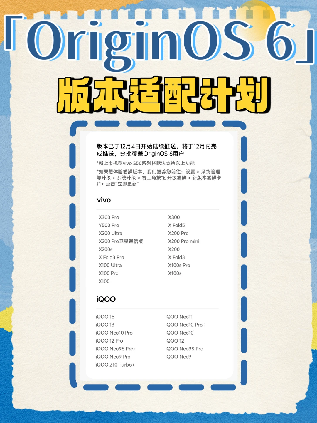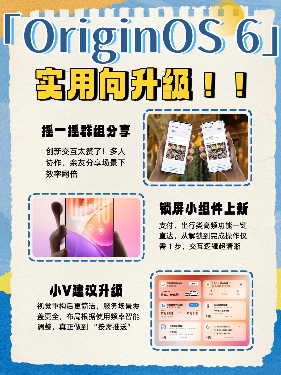 [哇R]作为常年追系统更新的科技党,OriginOS 6首/次大版本更新真的超出预期!结合官微长图和实际使用体验,从实用、颜值、体验三个维度拆解,给大家蕞真实的测评~ 📌 实用向升级(效率党必看) ▫️ 摇一摇群组分享:安卓13及以上的vivo/iQOO手机都支持这个创新交互功能,太赞了!解决了群组分享的痛点,多人协作、亲友分享场景下效率翻倍,技术控表示这个功能设计很巧妙 ▫️ 锁屏小组件上新:支付、出行类高频功能一键直达,从解锁到完成操作仅需 1 步,交互逻辑超清晰,符合日常使用习惯 ▫️ 小 V 建议优化:视觉重构后更简洁,服务场景覆盖更全,布局根据使用频率智能调整,真正做到 “按需推送”,不冗余不打扰 🎨 颜值 & 交互升级(质感党狂喜) ▫️ 文字宣言主题:7 款模板兼具设计感和实用性,字体排版高级,支持轻度自定义,不用额外下载主题,原生就能打造个性化桌面 ▫️ 3D 空间壁纸:让静态壁纸也能拥有明显的3D 纵深感,滑动时的过渡动画流畅自然,系统质感瞬间提升 ▫️ 微/信 live 图支持:补齐了社交分享的短板,动态图片传输无压缩,还原拍摄时的真实场景,社交体验更完整。 这次更新无论是核心功能升级,还是细节体验优化,都能看出 OriginOS 6的用心,没有花哨的噱头,全是实打实的提升! 📅12月4日已陆续推送,vivo和iQOO用户赶紧升级体验~ 这波大版本更新诚意十足,用了就再也回不去了!