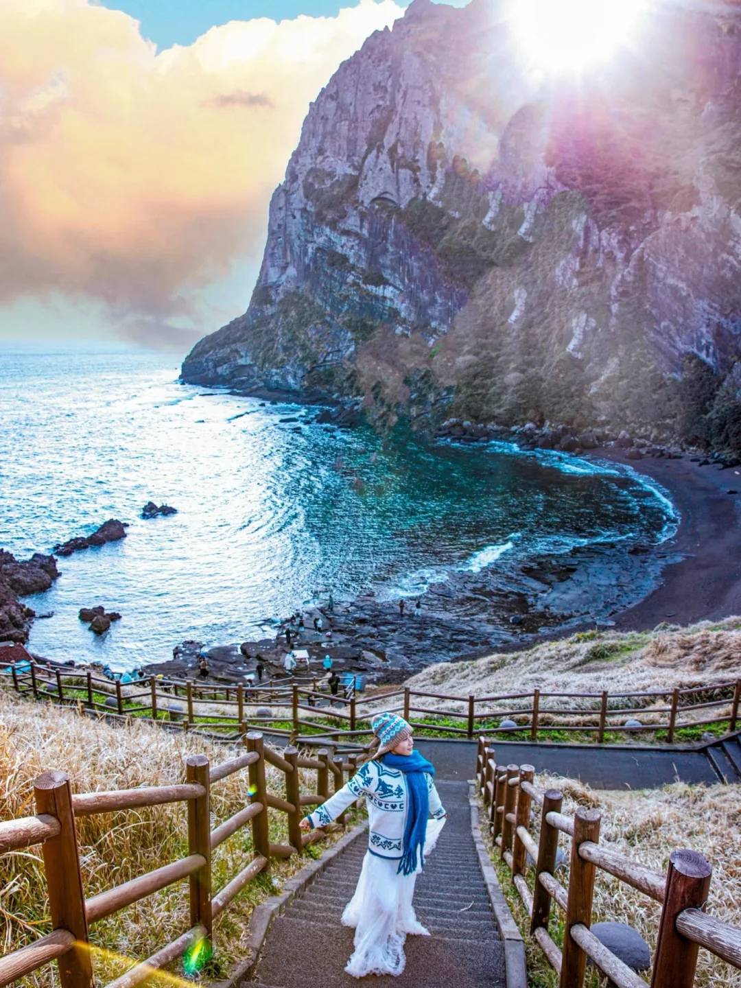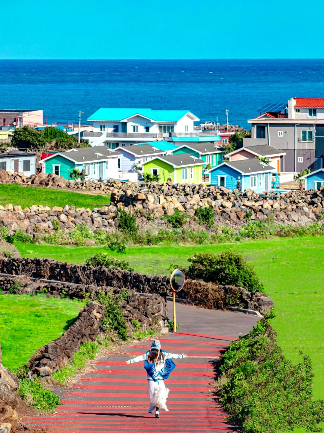 Day2️⃣城山日出峰("Seongsan Ilchulbong Peak",早去建议选"日出观景点停车场")→ 牛岛(先导航"城山港",乘船登岛后租电动车环岛,推荐路线:码头→彩色房子村→黑沙海滩