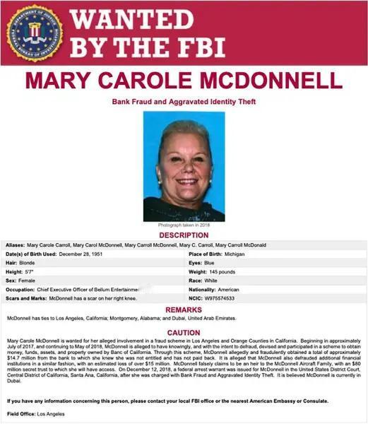 美国女子冒充公司继承人,骗取近3000万美元,逃往迪拜 近日,美国联邦调查局称,一名70多岁的女子被列入通缉名单。她冒充麦克唐纳公司女继承人,从加利福尼亚州的银行和金融机构骗取了近3000万美元,并逃往迪拜。 该女子名叫玛丽·卡罗尔·麦克唐纳,是密歇根州人。2017年7月至2018年5月期间,她散布虚假信息,声称自己是麦克唐纳公司的继承人,并有权支配一个8000万美元的信托基金。她先是从加州银行骗取了1470万美元,之后又从洛杉矶县和奥兰治县的其他金融机构获得了1500万美元。 联邦调查局称,2018年,联邦政府对麦克唐纳发出逮捕令,但她在被捕前逃往了迪拜。 来源:潇湘晨报综合报道 图:玛丽·卡罗尔·麦克唐纳。