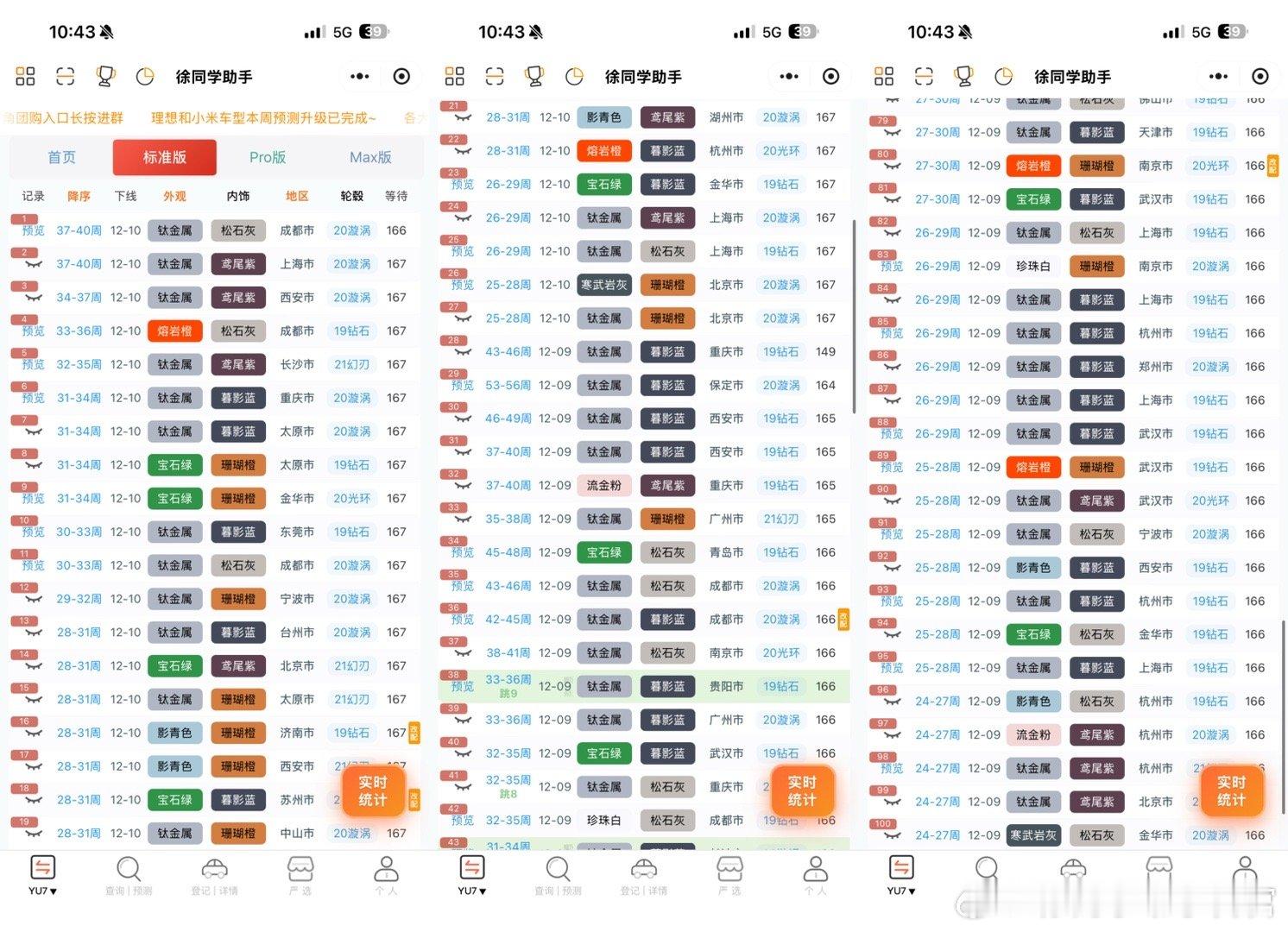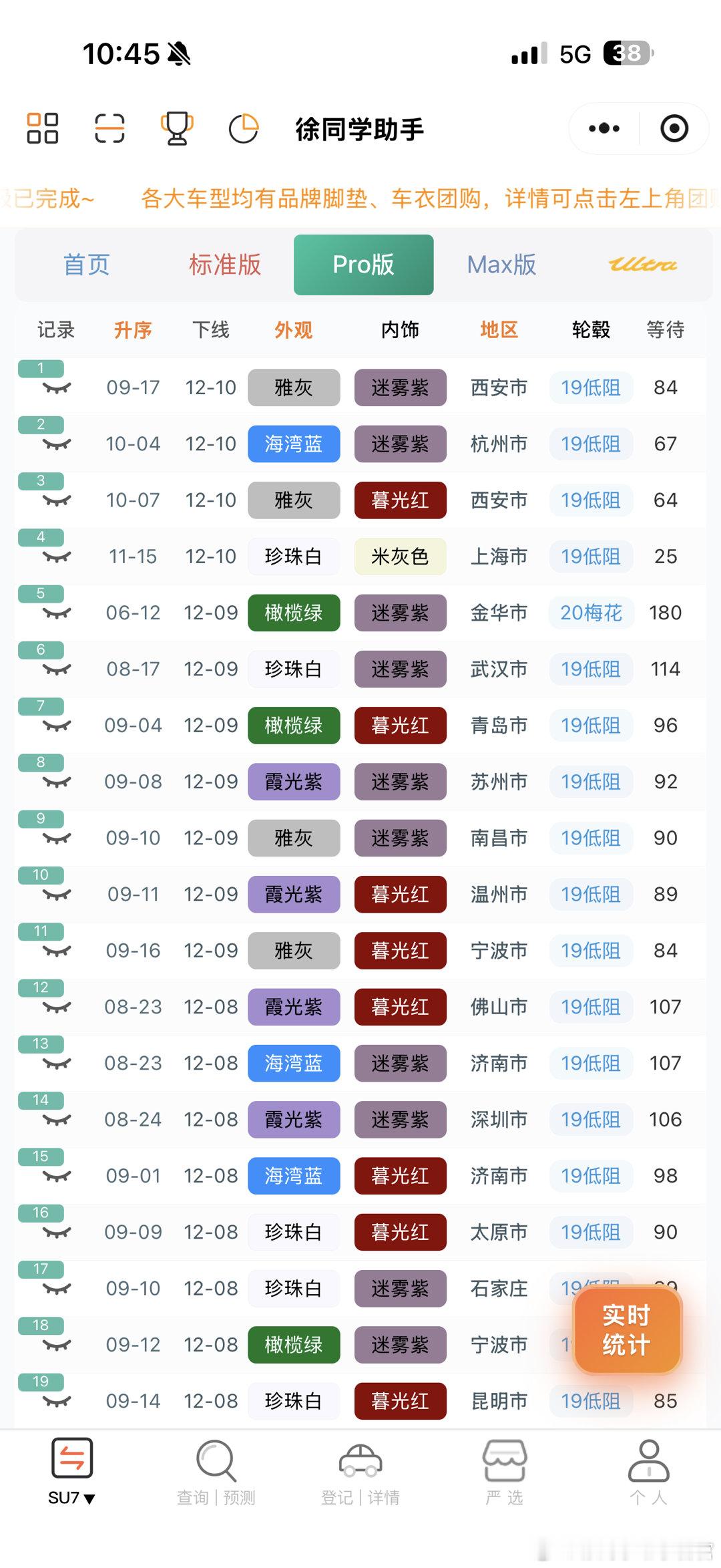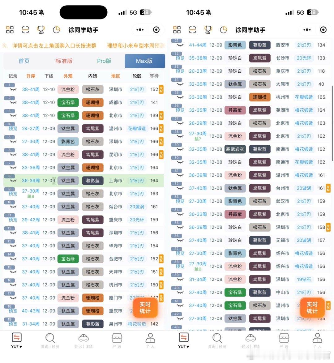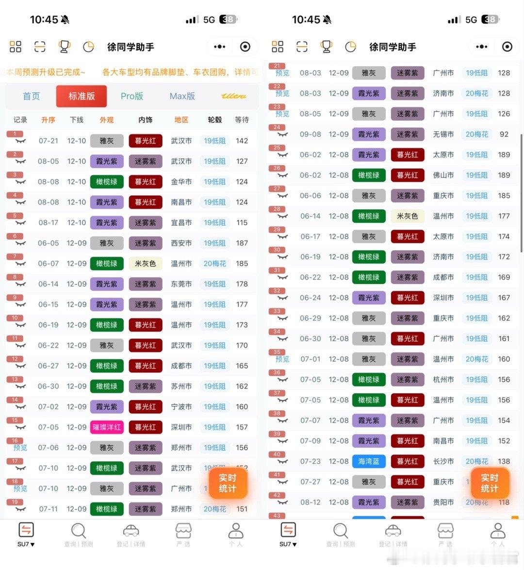 小米汽车(12月10日)下线实况【图一】排名40000左右的,在春节前提车问题不大有下线的就不会在排行界面显示了哦,所以大家的排名会有变动。已下线的在左下角蓝色字体小米现在的交付进度非常激进,大周数的随时下线,1.5w能省一点是一点。年前新车应该不会上市,起码得跨过春节,不然交付会很不理想🌀YU7(据不完全统计)合计202台1️⃣标准:下线125台,24-44周的都同屏下线了,除了好运,我想不到别的原因,任何时间的都有随时下线的可能,也不区分稀不稀有配置了2️⃣Pro:下线56台,30周左右的随时下线,开始出现7月份的订单了,丹霞紫好吃亏,太慢了3️⃣Max:下线21台,基本都是在下7月份的订单,21寸幻刃轮毂真多🌀SU7(据不完全统计)合计33台1️⃣标准:下线19台,6-7月的还有,不知道这个月怎么交付完,难不成要拖到春节2️⃣Pro:下线8台,这个月肯定就清仓了3️⃣Max:下线6台,等新款吧4️⃣ultra:无(这个月小米集中开发布会)更多关于小米汽车的最新资讯和深度解析,请参考【米车派】~徐同学助手小米汽车