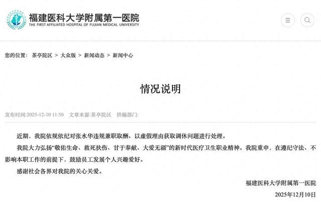 据央视网消息,12月10日中午,福建医科大学附属第一医院发布情况说明:近期,该院依规依纪对张水华违规兼职取酬、以虚假理由获取调休问题进行处理。