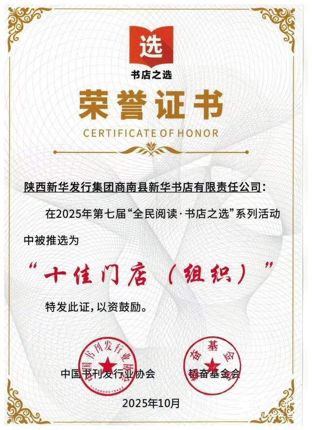 阳光讯(记者韩建军通讯员代绪刚文/图)日前,记者从商洛市商南县获悉,由中国书刊发行业协会、韬奋基金会主办,北京开卷信息技术有限公司协办,北京蠹鱼文化科技有限公司承办的第七届“全民阅读·书店之选”活动圆满落幕。商南县新华书店凭借在系列活动中的扎实组织、积极联动与突出表现,被推选为“十佳门店(组织)”,这份沉甸甸的荣誉由中国书刊发行业协会、韬奋基金会联合颁发认证。