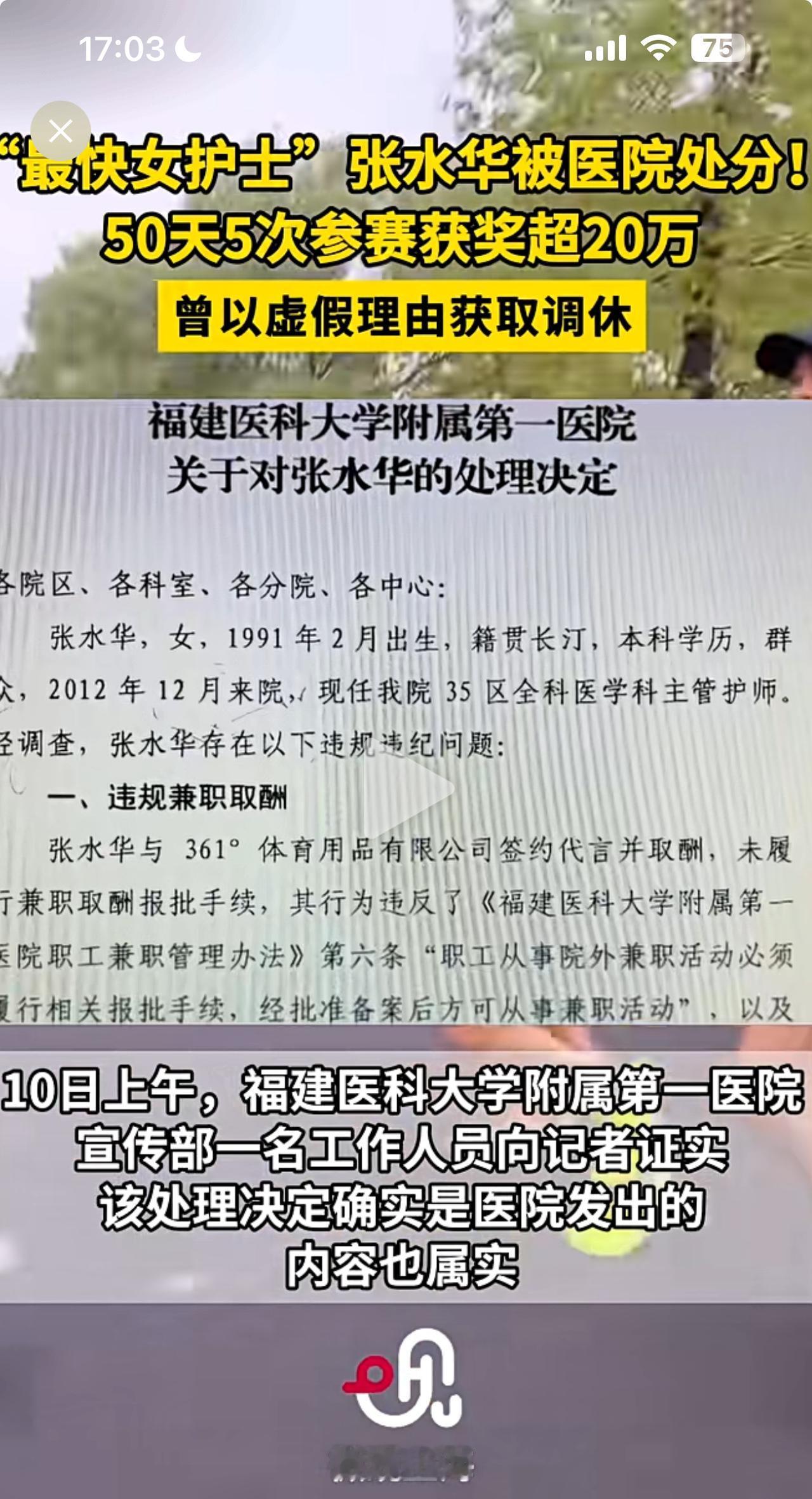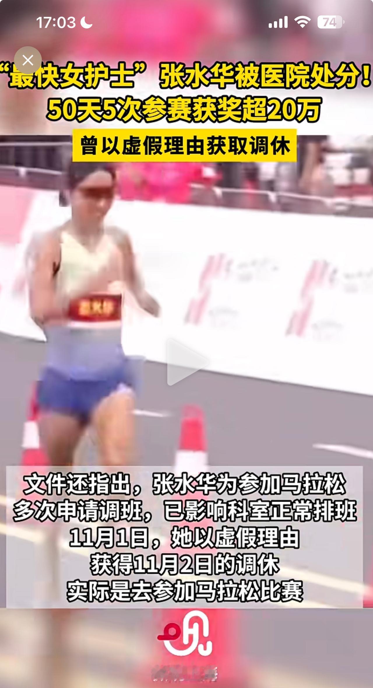 最快女护士被医院处分,原因是以虚假理由获得调休,违规兼职取酬。 这个事情怎么说呢!我认为,只要不影响本职工作,我觉得完全可以给她假的。 一个护士,马拉松的业余爱好者,能够取得全国性的成绩很难得,医院应该适当支持一下! 此外她的兼职取酬,这个与她从事的医疗行业没有直接利害关系,应该可以吧? 你们怎么看这件事?