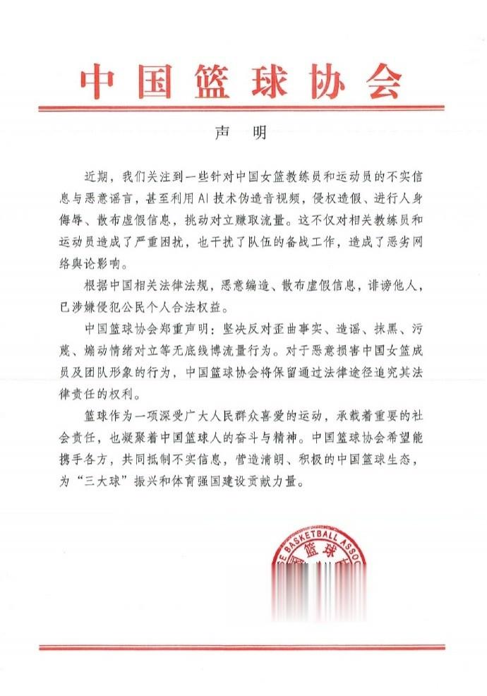 近期,我们关注到一些针对中国女篮教练员和运动员的不实信息与恶意谣言,甚至利用AI技术伪造音视频,侵权造假、进行人身侮辱、散布虚假信息,挑动对立赚取流量。这不仅对相关教练员和运动员造成了严重困扰,也干扰了队伍的备战工作,造成了恶劣网络舆论影响。
