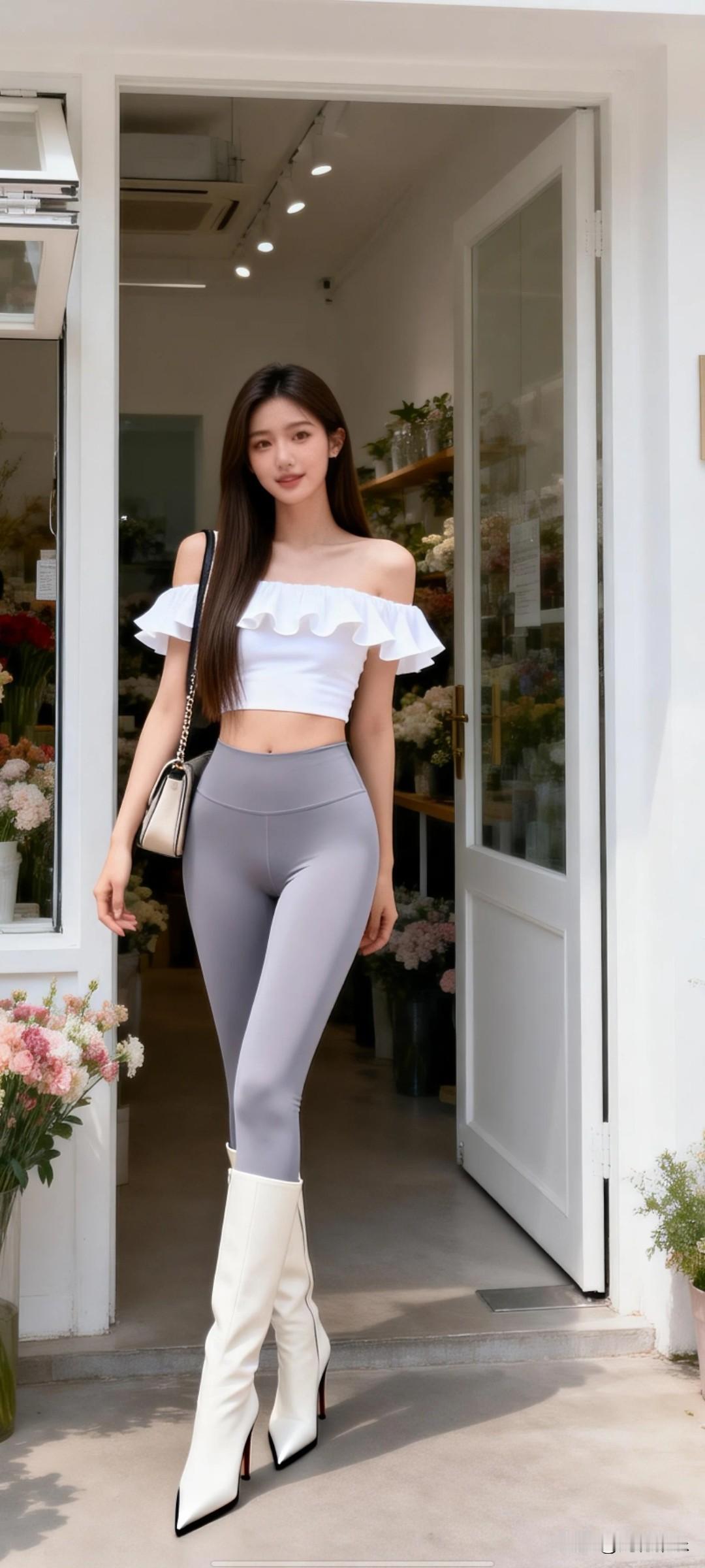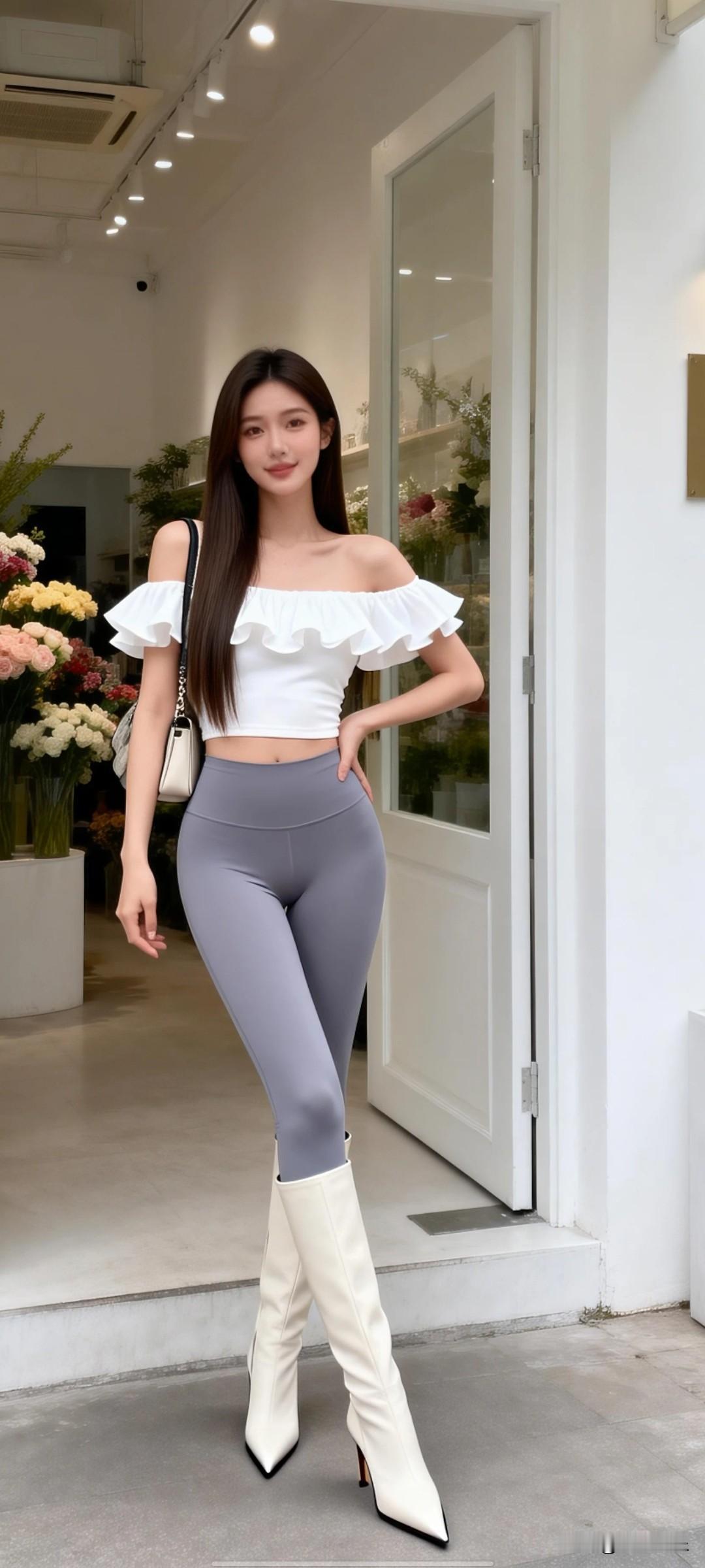 优雅气质穿搭,白色荷叶边上衣搭配灰色紧身裤,脚踩白色高跟靴,完美展现时尚魅力!