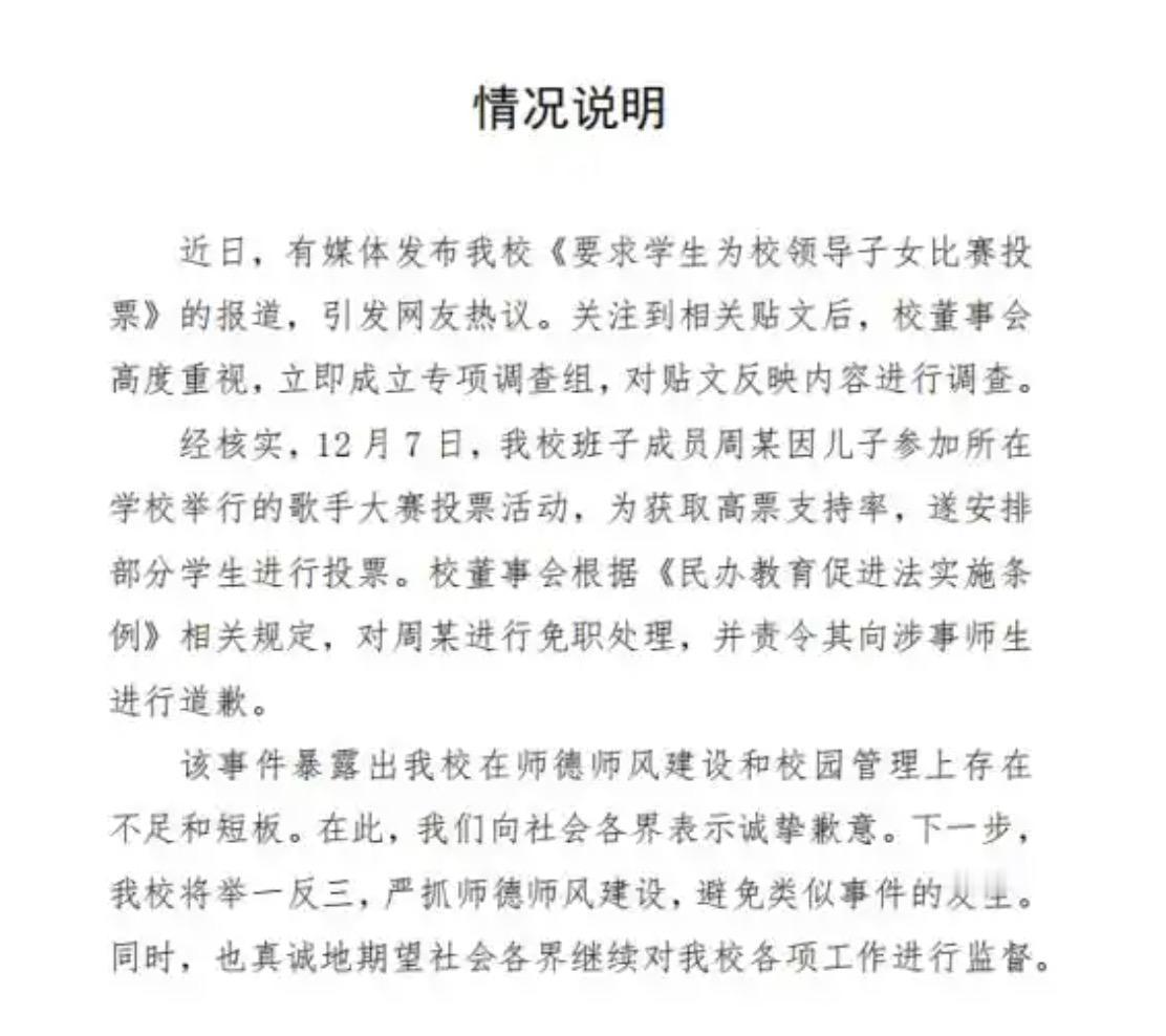校领导的儿子参加校园歌手大赛,为了让其儿子获得高投票,竟然给学校的师生安排下任务,给其儿子进行投票! 这起奇葩的事情发生在郑州电力中等专业学校,有老师在群内要求学生,为学校领导在浙江一所大学,参加校园歌手大赛的儿子投票,有学生就把这事给捅到了网上。随后这名学生的班主任得知后,就要求这名学生删除视频,随后二人就发生了不愉快,这事就越闹越大!而在12月10日涉事学校发布情况通报,称网传的事情属实,涉事的周姓领导,已经被学校免职,并且还让其对师生进行道歉。 事实上这个事还真不是啥大事,现实中类似的拉票情况,也是很常见的,可为何给自家孩子拉个票,就闹成了一起舆论事件?在我看来是有两方面的原因,一个是因为这件事本身就是典型的以权谋私,是不具备合理性的。另外一个就是相关人员,在处理这件事时,不够圆滑。给领导孩子拉票,给同事孩子拉票,大家都知道这是不合理的,可最后还是会帮忙的! 之所以如此,无非是因为要么是,出于讨好,要么是迫于面子。如果有选择的话,涉事的老师肯定不会帮领导孩子拉票,之所以帮忙无非是怕,领导给穿小鞋,以后日子不好过。所以后来他在处理这件事时,只是按照工作流程来处理的,称是领导交代的一项重要任务,让大家务必重视,所以才引来学生的不满。 其实这位老师,只需要换一种说辞,称是领导的孩子参加比赛,大家可以支持一下,随后再有所表示,比如请大家喝个奶茶,大家也肯定愿意配合。这位老师为何没圆滑处理?根源还是这位校领导这。他公私没有界限,把自己的私事,当成了公事来办,底下的人心里不爽,好好办事才怪!因此闹得个如此的结果,也怪不了别人,要怪只能怪这个周姓领导,一点都不懂人情世故。
