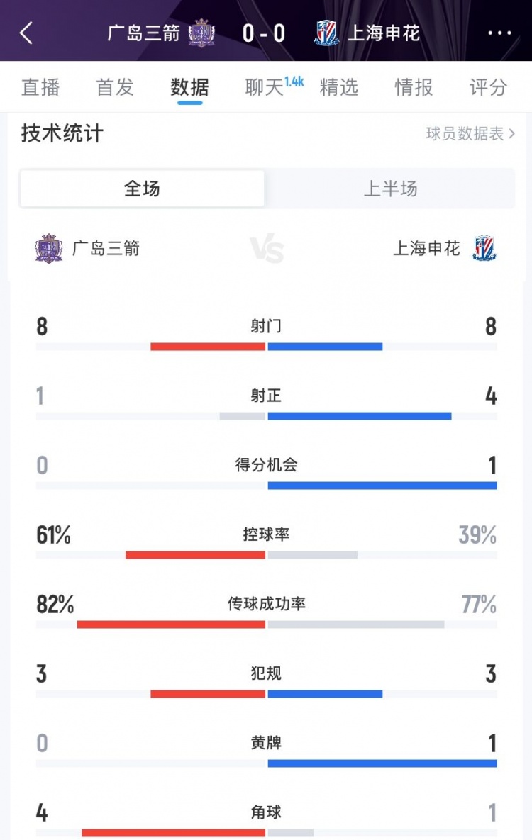直播吧12月10日讯亚冠精英联赛东亚区第6轮,上海申花客场对阵广岛三箭,目前半场结束双方0-0。半场两队数据如下(主队广岛三箭在前):