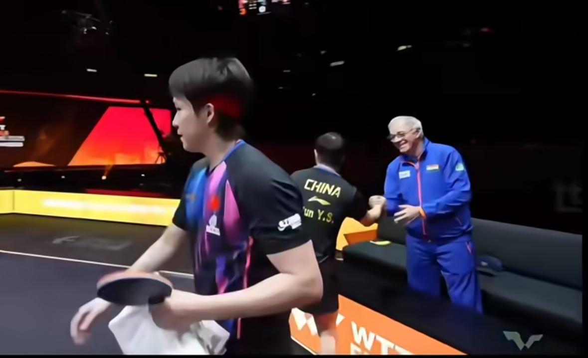 印度教练对孙颖莎说“good luck” 12月10日,WTT香港总决赛首日 开赛! 孙颖莎/王楚钦在混双小组赛 第一轮3:0玛纳什沙/奇塔莱 赛后对手教练见到莎莎, 高兴的合不拢嘴“good luck” 这个教练是意大利人, 执教印度队, 非常欣赏孙颖莎, 而且他还会用中文称呼孙颖莎“莎” 总是一脸慈爱的样子看着莎莎, 莎莎的国际影响力真的很大, 总决赛, 孙颖莎加油!