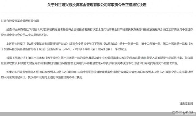 根据有关规定,甘肃证监局决定对甘肃兴掖投资采取责令改正的行政监管措施,并记入证券期货市场诚信档案,并要求其应当汲取教训,积极整改,健全内部治理结构,加强合规风控管理,切实履行私募基金管理人职责,并提交书面整改报告。