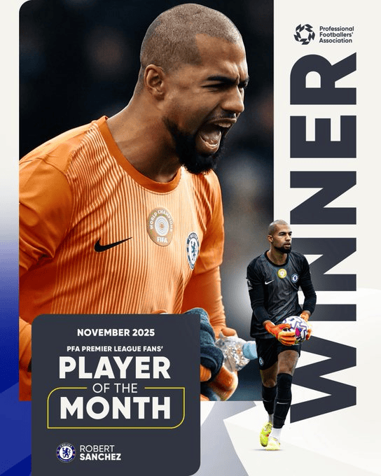 在11月的比赛中,桑切斯代表蓝军出战4场比赛,贡献3场零封仅丢1球,他也击败了萨卡,大马丁等人成功当选。