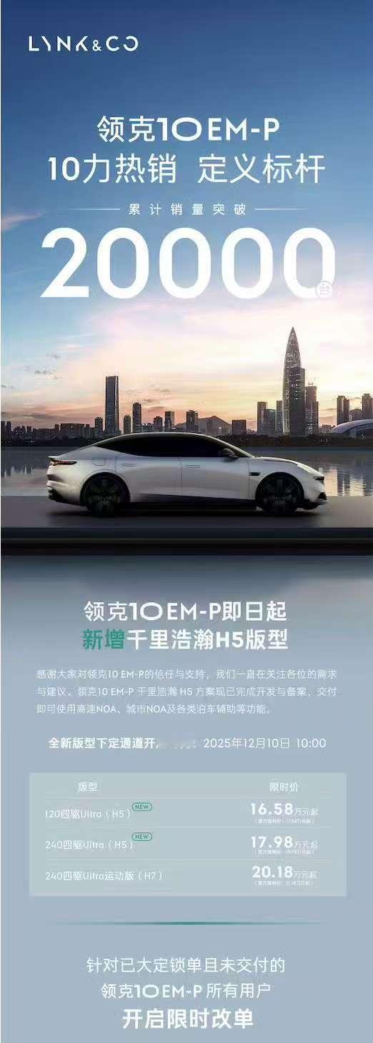 领克10EM-P销量快速突破2万 领克10 EM-P这“混动卷王”刚上市仨月,直接把2万台的KPI给干穿了——这速度,堪比早八人冲电梯的手速!能在混动圈杀疯,全靠它那“价值平权”的小心思:别人是“一分钱一分货”,它偏要“花买菜钱享豪华席”——主流价就能抱走智能电混四驱、全场景智驾,续航焦虑?不存在的;钱包压力?直接踹飞;连开车的快乐都给你焊死在方向盘上,这哪是买车,分明是“把用户的需求清单全打勾”!现在混动圈都卷成麻花了,但领克10 EM-P证明了,光“卷配置”没用,得“卷到用户心坎里”。这不,刚卖爆就上新千里浩瀚H5版型,跟开盲盒似的——想要性价比?16万多的四驱版直接揣兜;想要进阶体验?更高配也安排明白,主打一个“你要的我都有,还比别人香”。只能说,现在买混动的人精着呢,谁能把“痛点痒点”一起拿捏,谁就是“天选销冠”。领克10 EM-P这波,属于是把“用户想要的”和“市场需要的”都给焊死了——活该它卖爆!高价值混动轿车首选