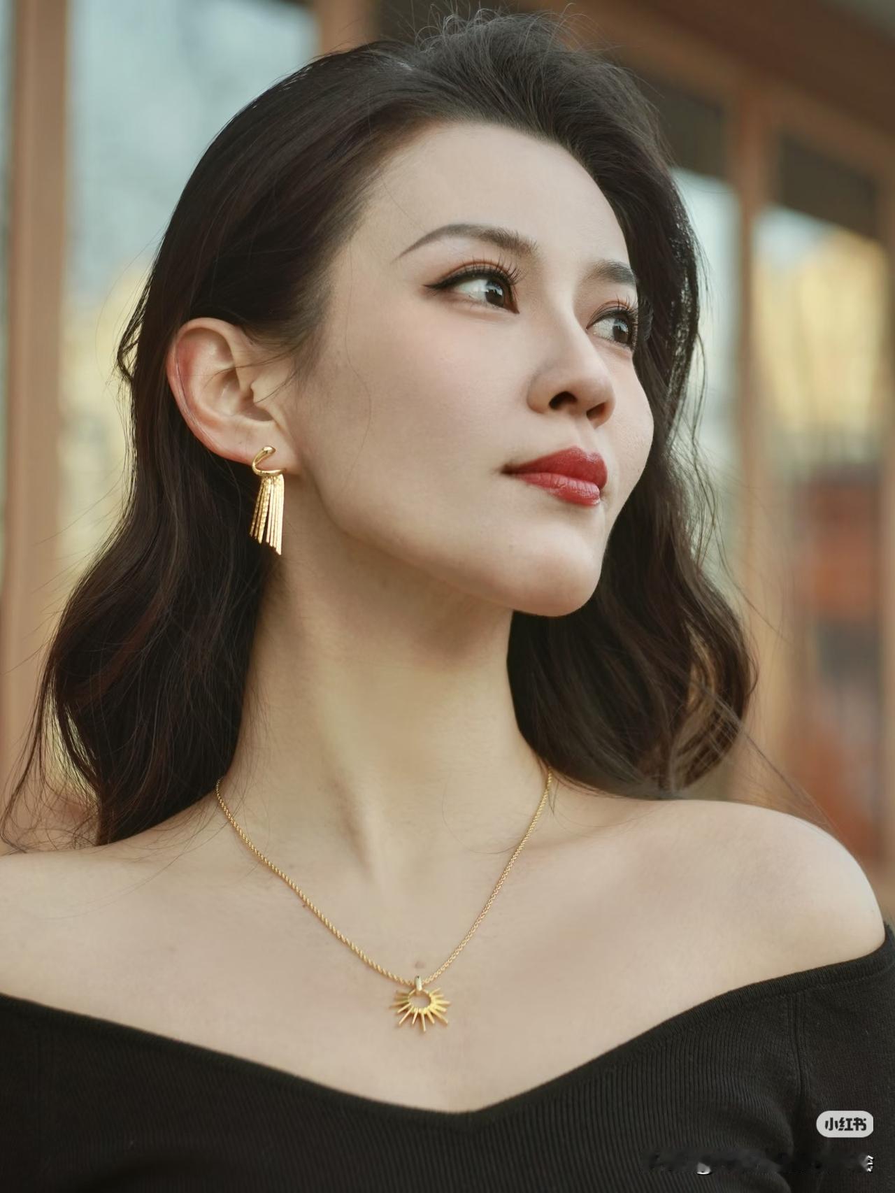 艳红露肩裙衬着柔润肩线,长发轻垂裹着清甜笑意,像揉碎的暖阳落进眼底,明媚得刚好。