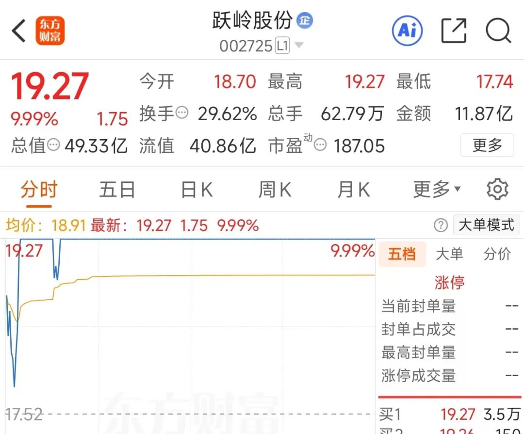 2025年12月10日,跃岭股份涨停,走出两连板,收报19.27元/股,总市值为49.33亿元。