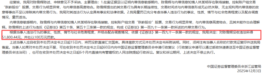 经复核,浙江证监局对陈雪辉陈述、申辩意见不予采纳。根据当事人违法行为的事实、性质、情节与社会危害程度,并结合配合调查情况,依据《证券法》第一百九十一条第一款的规定,浙江证监局决定:对陈雪辉没收违法所得51800.44元,并处以100万元罚款。