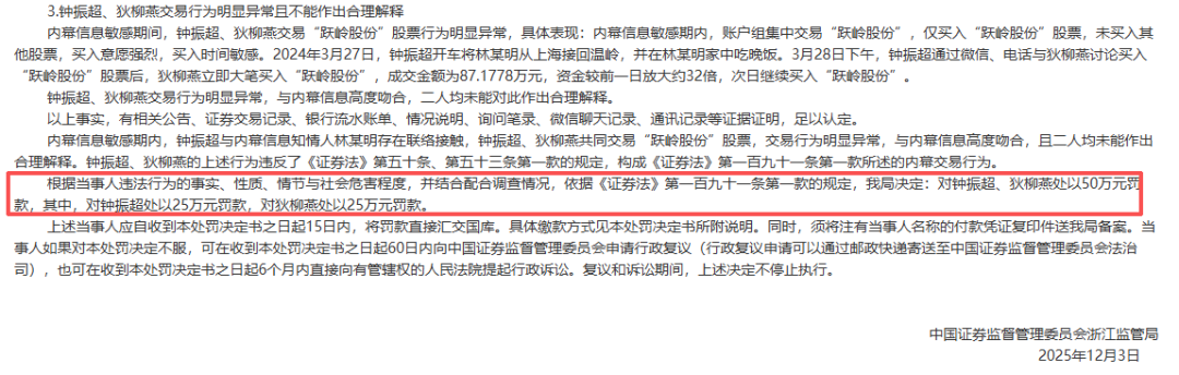 12月9日,浙江证监局官网发布四则行政处罚决定书,披露内幕交易细节,其中,钟振超与狄柳燕、陈雪辉等人因内幕交易跃岭股份股票被罚,三人与跃岭股份前董事长林仙明均存在密切联系。