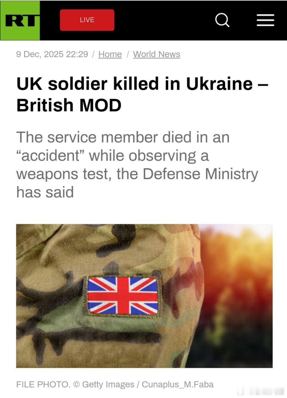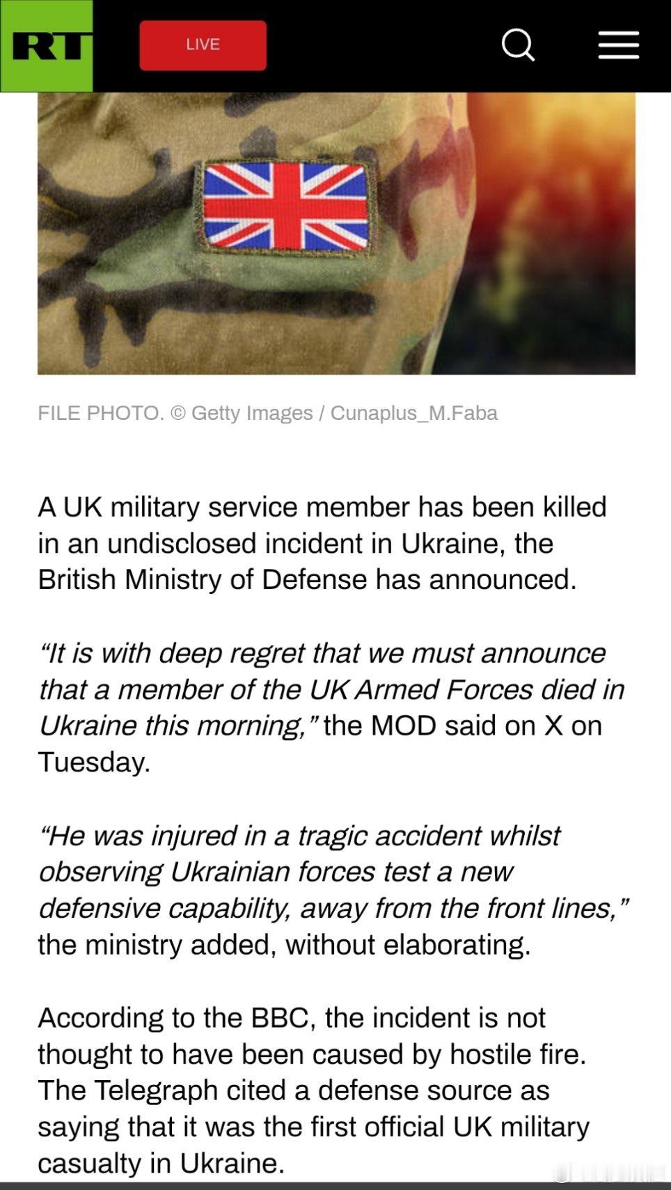 俄乌冲突烽火问鼎计划 英国国防部:一名英国士兵在乌克兰丧生英国国防部宣布,一名英国军人在乌克兰的一起未公开的事件中丧生。国防部在周二的推文中表示:“我们深感遗憾地宣布,一名英国武装部队成员今天在乌克兰不幸身亡。”该部门补充道:“他在一次悲惨的事故中受伤,当时他正在远离前线的地方观察乌克兰军队测试一种新的防御能力。”但该部门并未进一步详细说明。据英国广播公司报道,此次事件并非由敌对火力所致。《每日电讯报》援引一位军方消息人士的话称,这是英国在乌克兰的首例官方军事人员伤亡事件。(今日俄罗斯RT网)