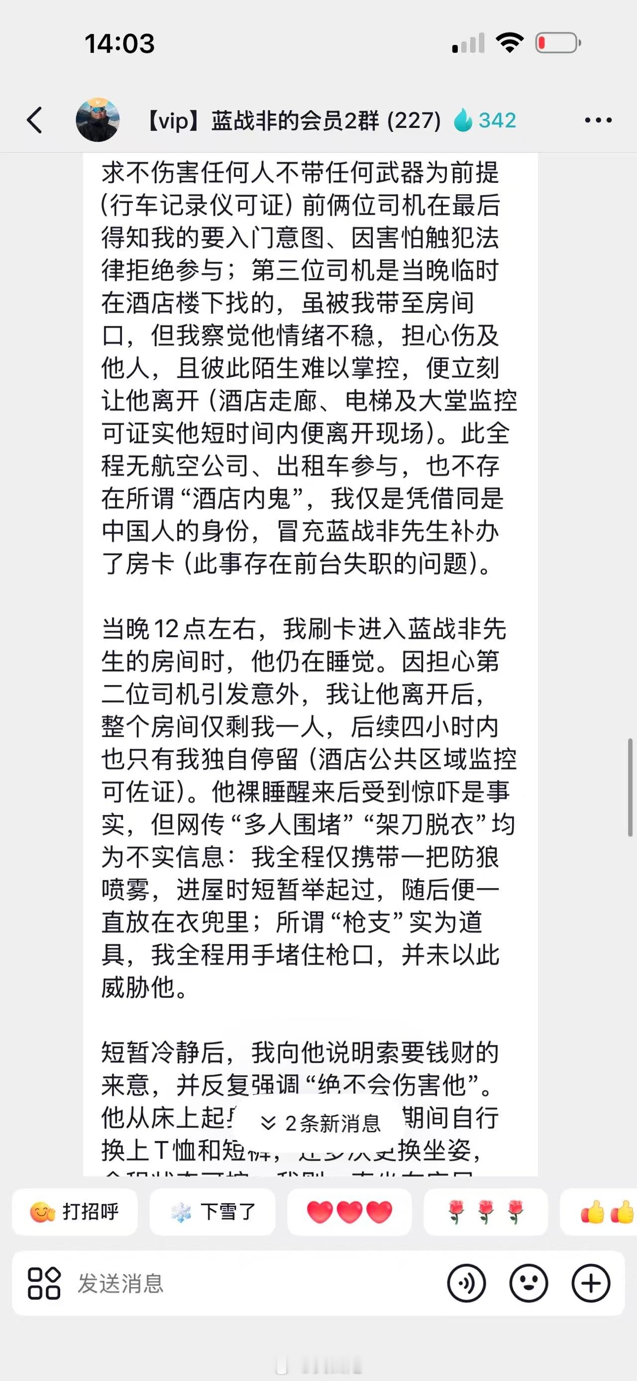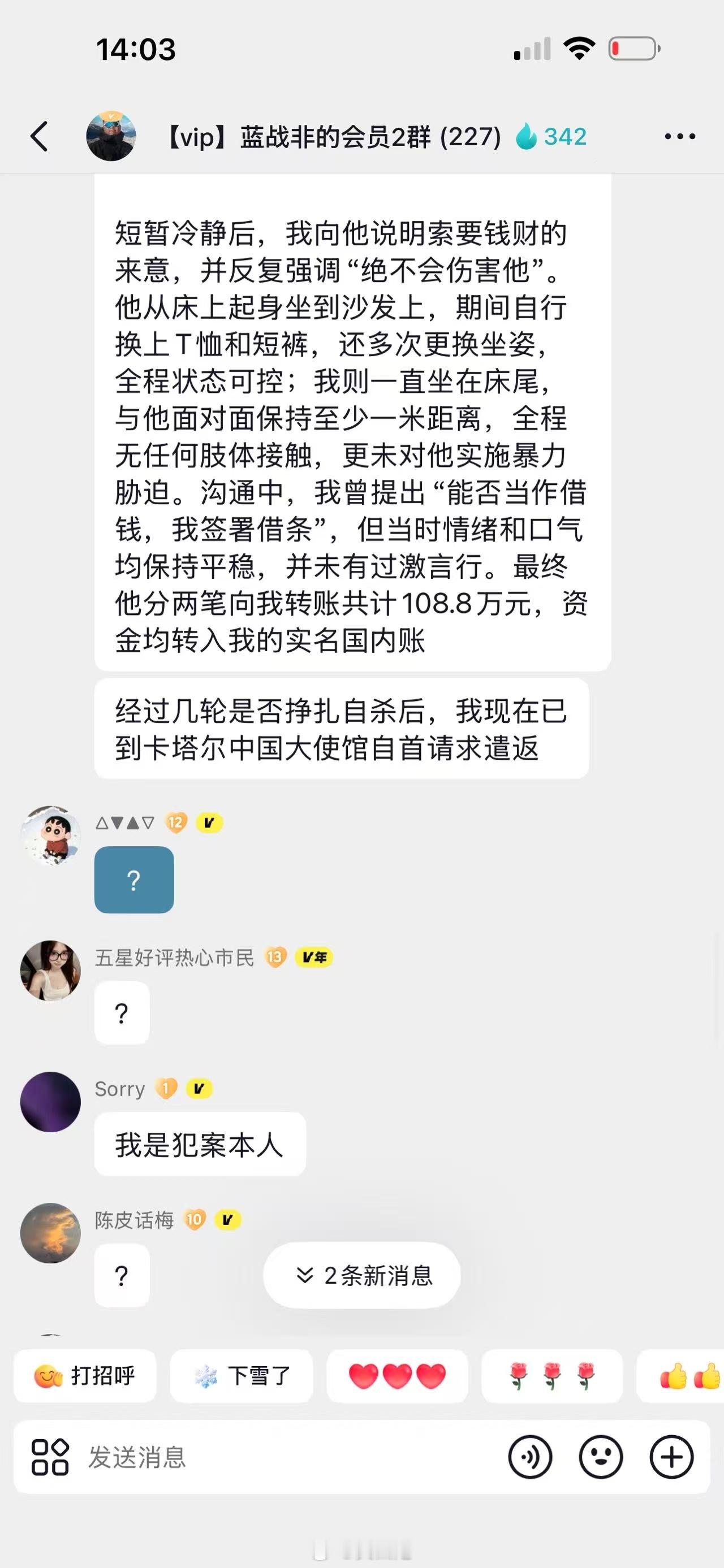 蓝战非会员群里的聊天记录,有人自称是实施非法行为的当事人,并称已自首请求遣返!分