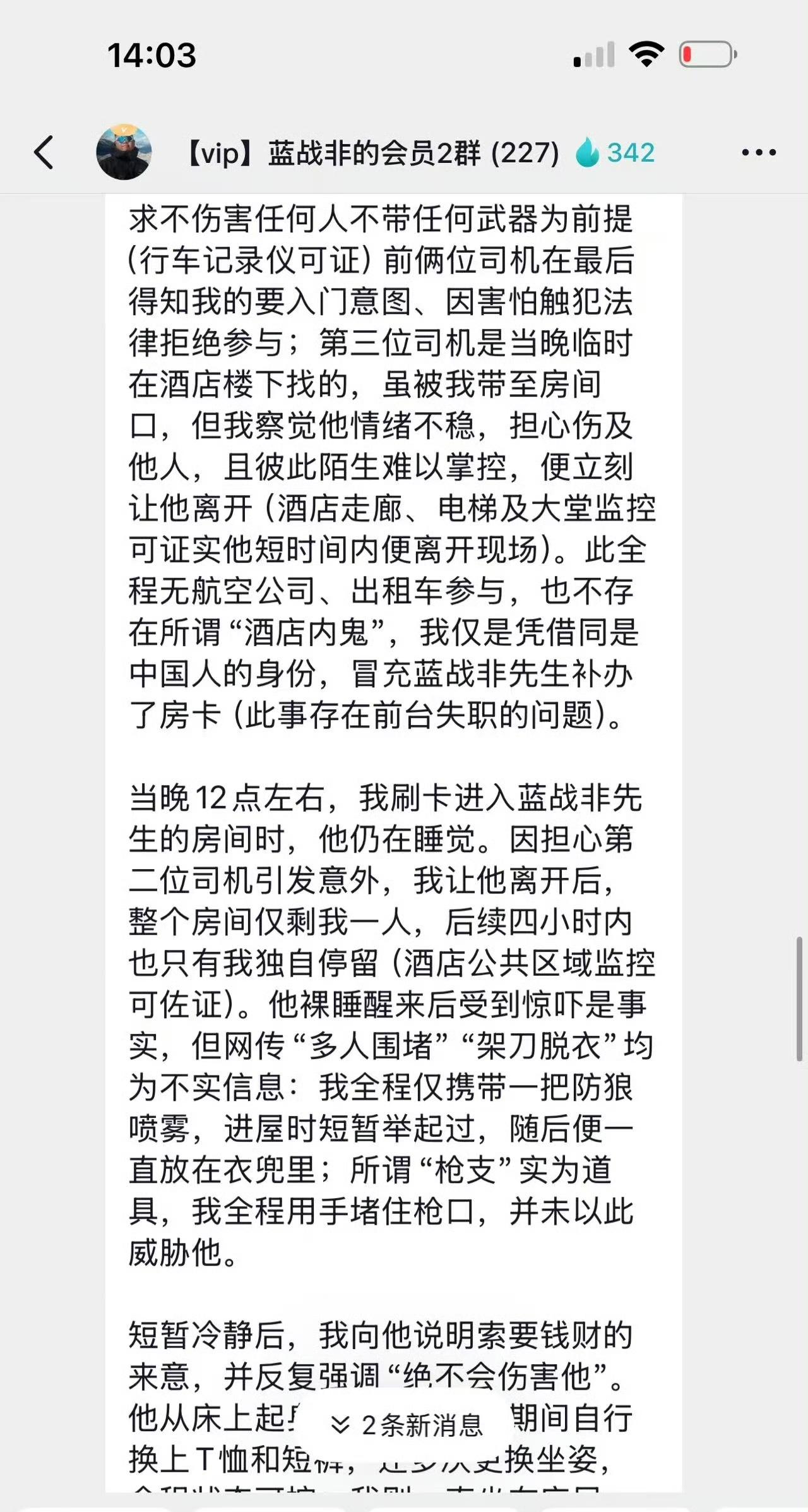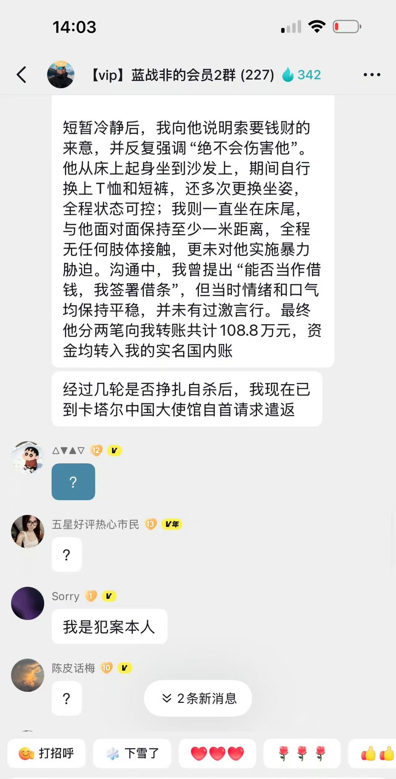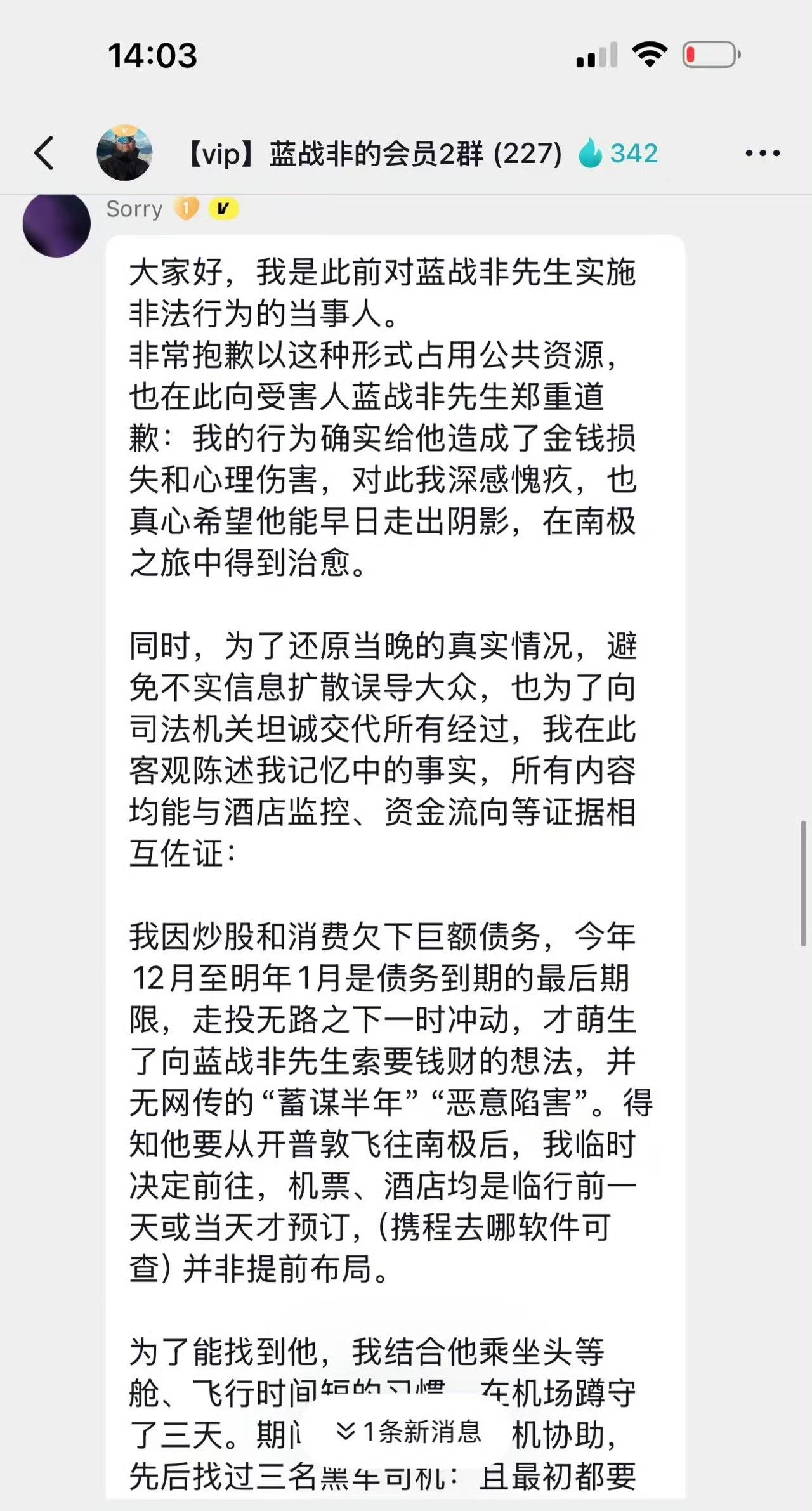 蓝战非事件绑匪自曝身份! 称因炒股欠债走投无路,临时起意在开普敦对蓝战非索要钱财。其声称全程未使用暴力,仅持防狼喷雾进入房间,与蓝战非沟通数小时后获转账108.8万元,承诺退赔并希望取得谅解。 一般来说,这么大额的资金周转,银行都是有风控的。 这到底是个人炒作还是真心投案,目前还不得知。 目前这事在网上闹的沸沸扬扬,各路消息都有,先让子弹飞一会,相信不久后官方会通报。