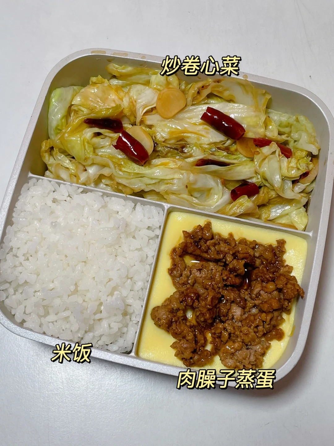 📍米饭+肉臊子蒸蛋+炒卷心菜