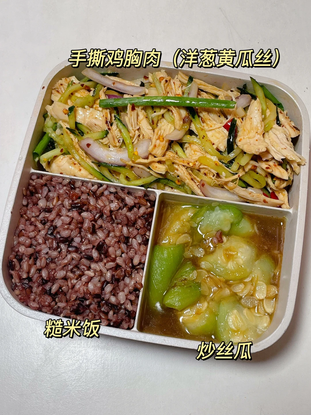 📍糙米饭+手撕鸡胸肉+炒丝瓜