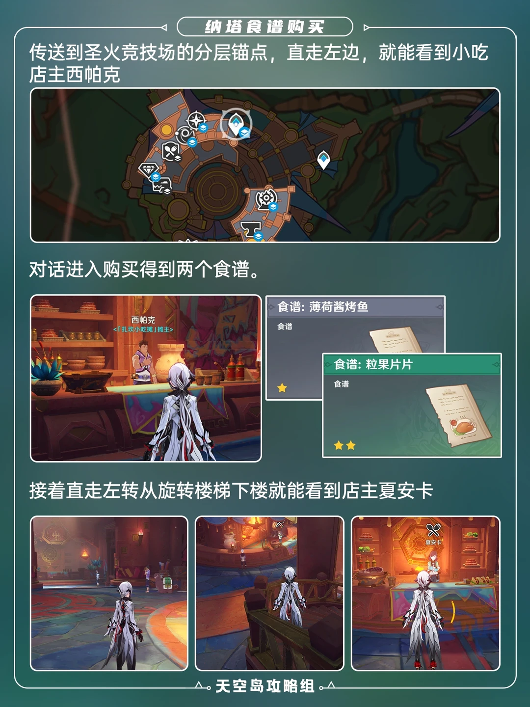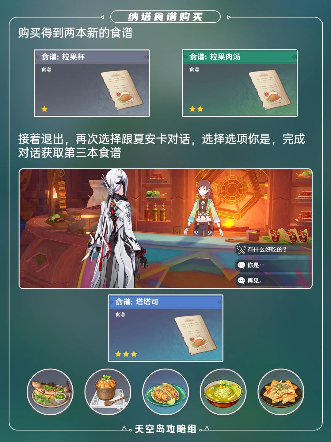 纳塔5.0版本食谱购买![飞吻R]看看这些你都集齐了吗? 1⃣️圣火竞技场-西帕克处购买:薄荷酱烤鱼、粒果片片 2⃣️圣火竞技场-夏安卡处购买:粒果杯、粒果肉汤、对话得到:塔塔可
