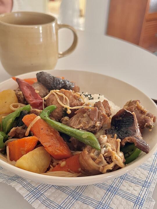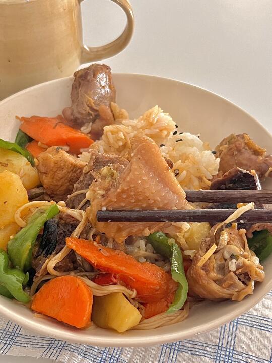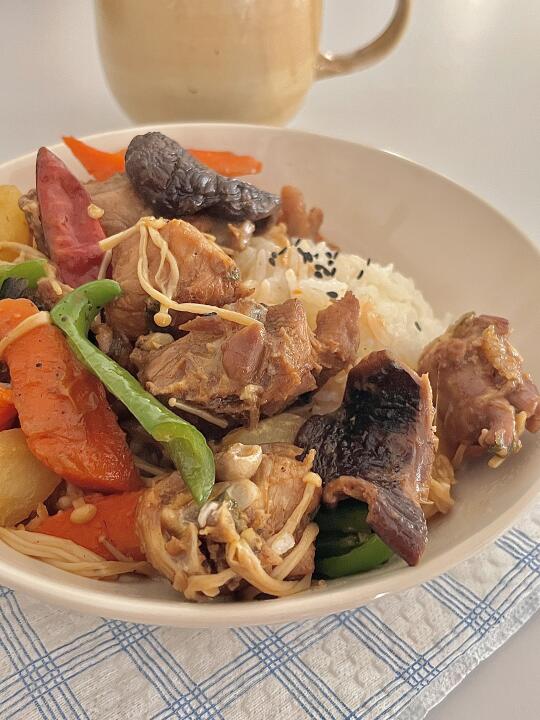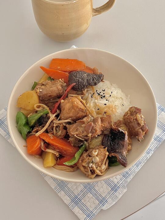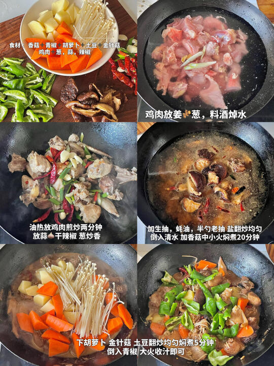 我的减脂餐 今日份减脂餐来喽,黄焖鸡配上米饭,搭配色彩缤纷的蔬菜,不仅提供丰富膳食纤维,还让营养更均衡! 食材 :鸡肉 土豆 青椒 金针菇 胡萝卜 干香菇 干辣椒 大蒜 生姜 葱 做法: 1️⃣鸡肉冷水下锅,加姜片料酒葱焯水,煮出浮沫捞出洗净备用! 2️⃣油热放鸡肉煎炒,放入葱蒜干辣椒翻炒,放生抽、蚝油、盐、本勺老抽翻炒均匀加清水沫过鸡肉,香菇放进去中小火焖煮20分钟! 3️⃣最后放入土豆🥔胡萝卜金针菇在煮5分钟 下青椒翻炒2分钟入味即出锅! 简单易学又下饭,快来动手试一试吧~