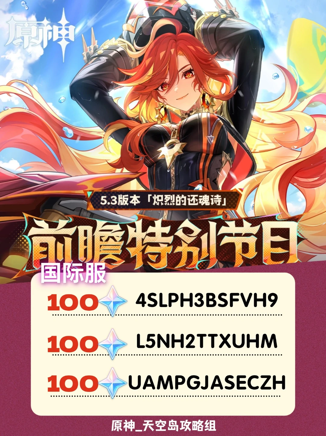 5.3版本前瞻特别节目将于12月20日晚8点正式开启。 △5.3版本前瞻特别节目兑换码已施工🚧 国服兑换码: ①国服: ①CXDFS4CNBJRN ②PEUWTLCPB2R2 ③8EVXSMCPCYAA 国际服: ①4SLPH3BSFVH9 ②UAMPGJASECZH ③LT5NH2TTXUH