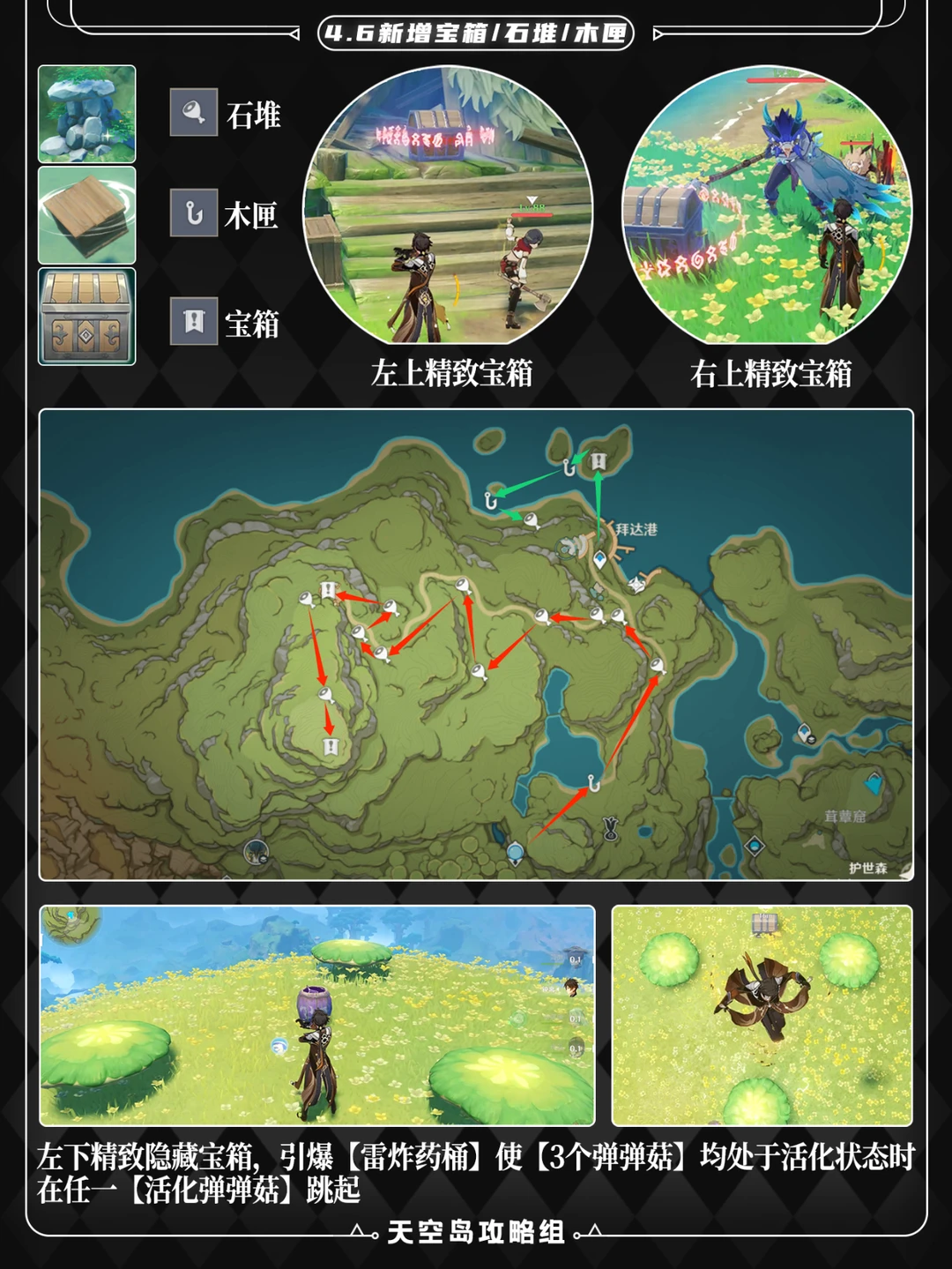 4.6版本须弥地图:拜达港-新增宝箱、木匣、石堆攻略[哇R] 共3精致宝箱,其中左下为隐藏宝箱,需要活化弹弹菇~
