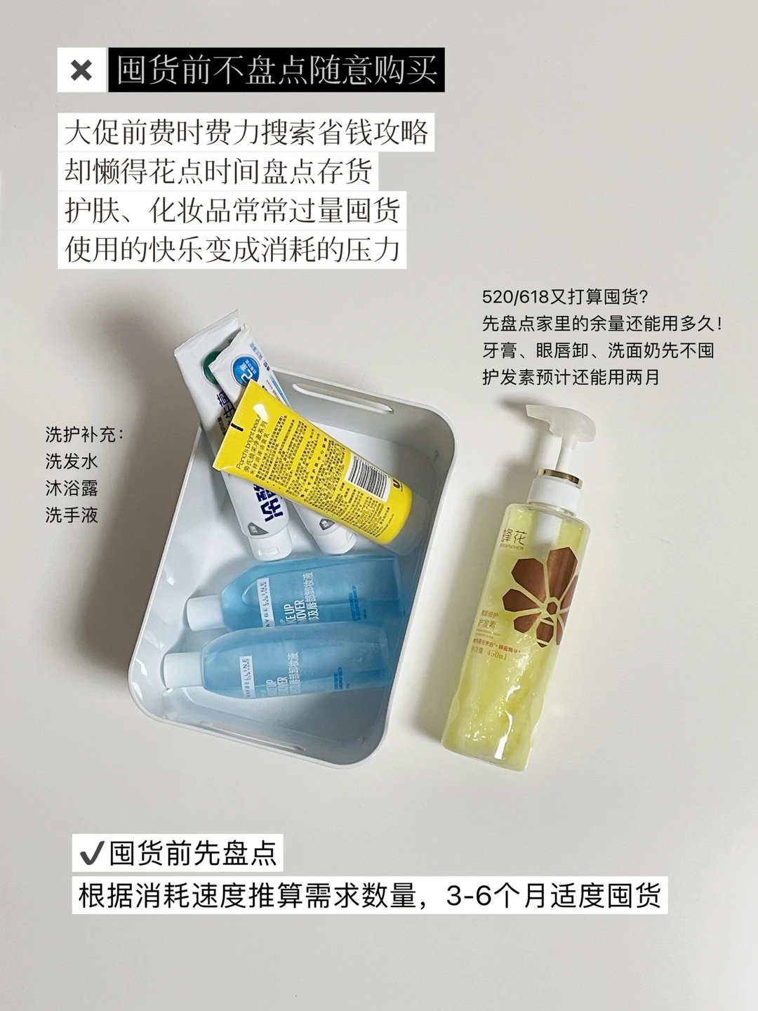 ✔囤货前先盘点。根据消耗速度推算需求数量,3-6个月适度囤货
