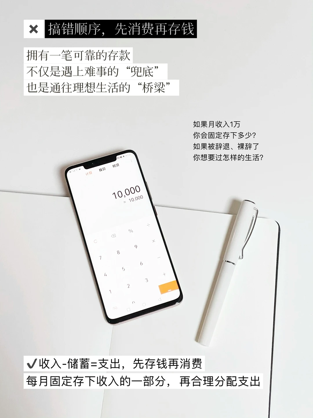 ✔收入-储蓄=支出,先存钱再消费。每月固定存下收入的40%,再合理分配支出