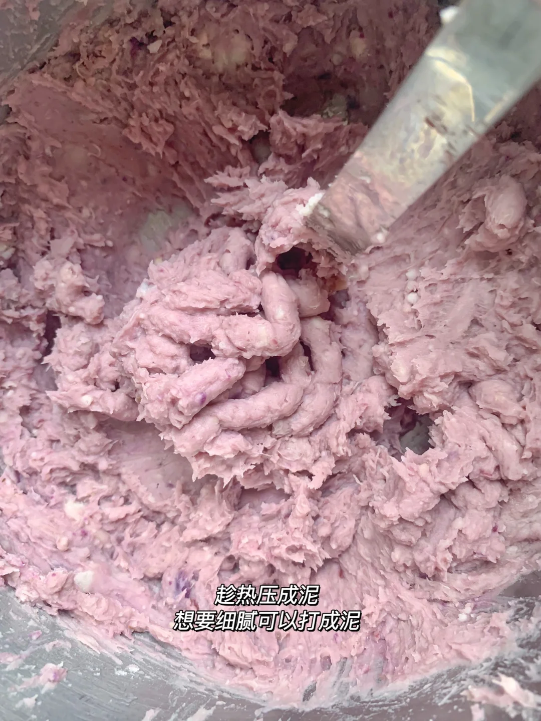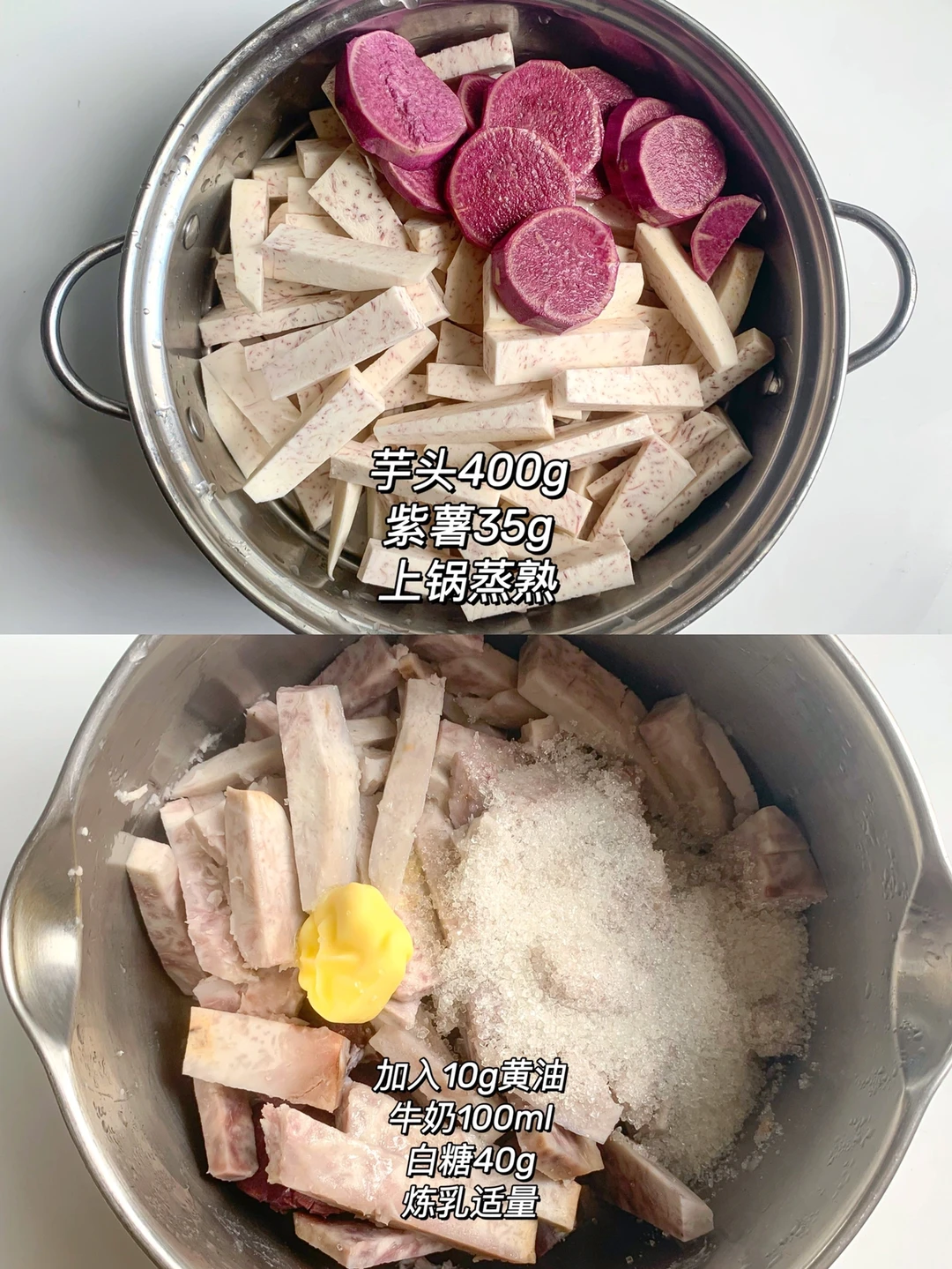 想把这个芋泥馅安利给所有爱吃芋泥的姐妹[害羞R][害羞R] 外面的芋泥相关的甜点要么太甜,要么太贵。按照这个比例来,一次成功,在家实现芋泥牛乳,面包陷等[派对R] - 芋头400克 紫薯35克 白糖40克 黄油10克 牛奶100毫升 . 👩🍳做法: 1⃣️芋头和紫薯去皮切小,上锅蒸熟 2⃣️趁热加入黄油,糖和牛奶,压成泥(喜欢细腻的,可以放入料理机打成泥) - 🌈芋泥里加入牛奶或者椰汁,都很好喝