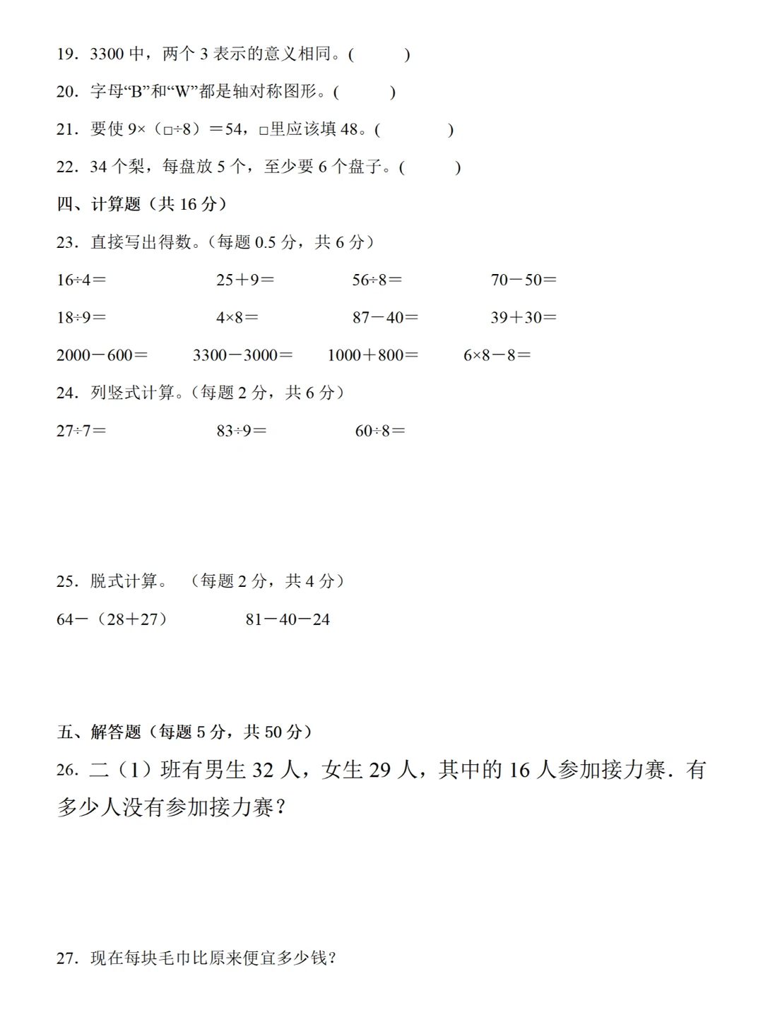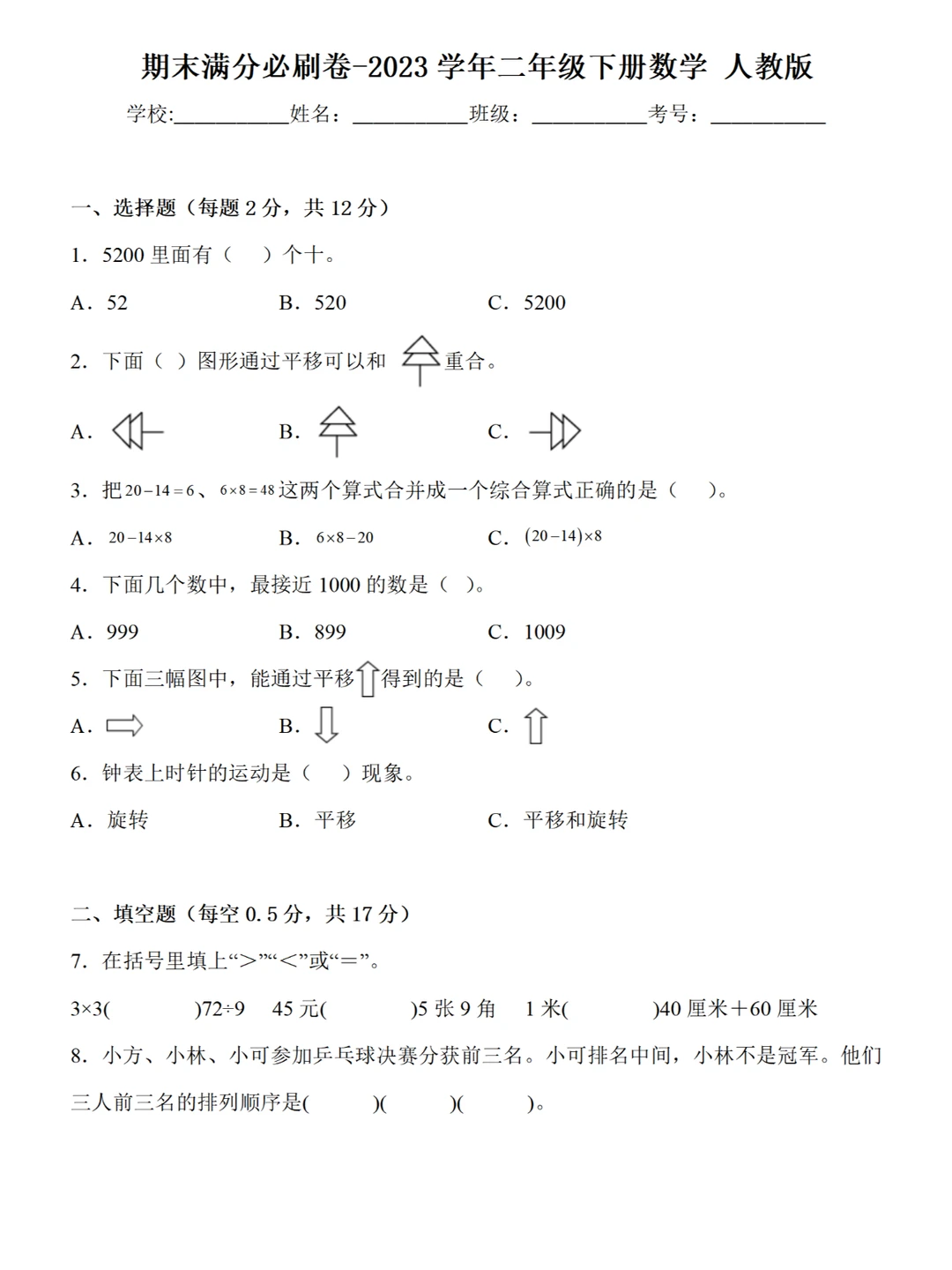 📚人教版小学数学:二年级下册期末考试复习满分必刷卷❗❗