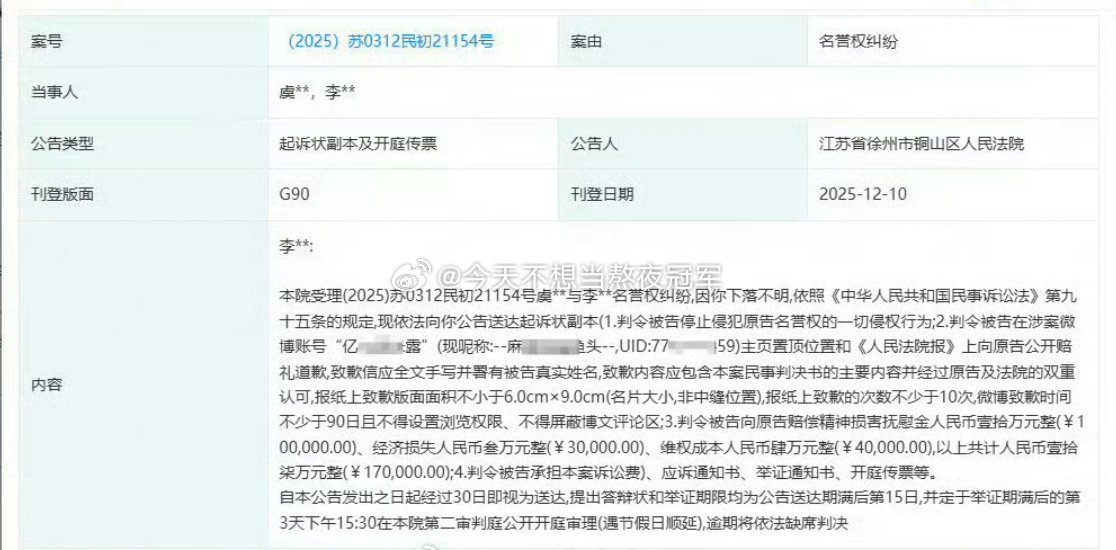 虞书欣父亲维⭕案要开庭了,索赔17w➕要求公开赔礼道歉,目前被告仍然下落不明 虞书欣父亲维权案将开庭虞书欣父亲维权索赔17万
