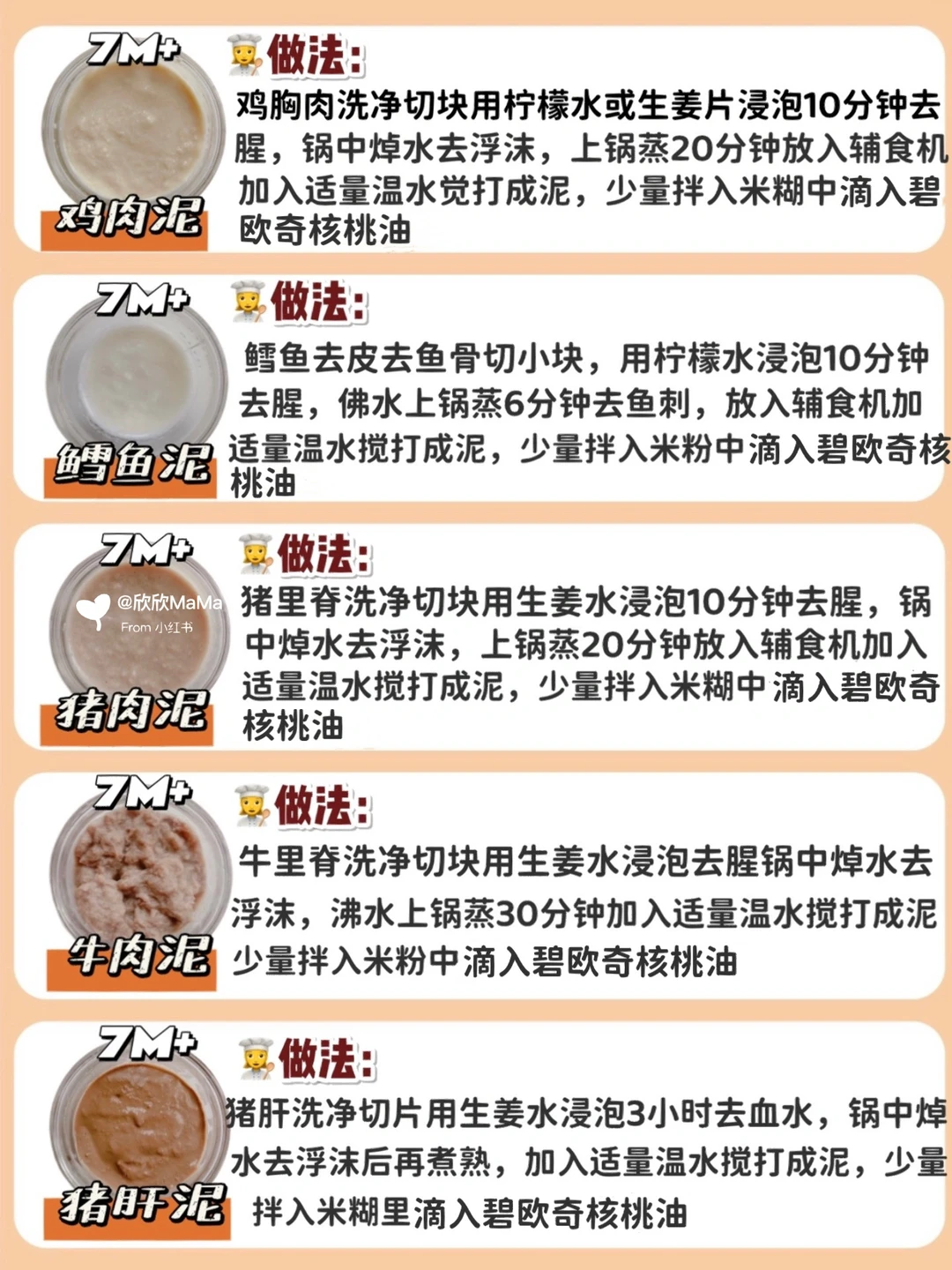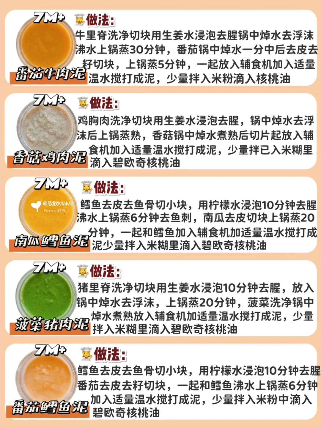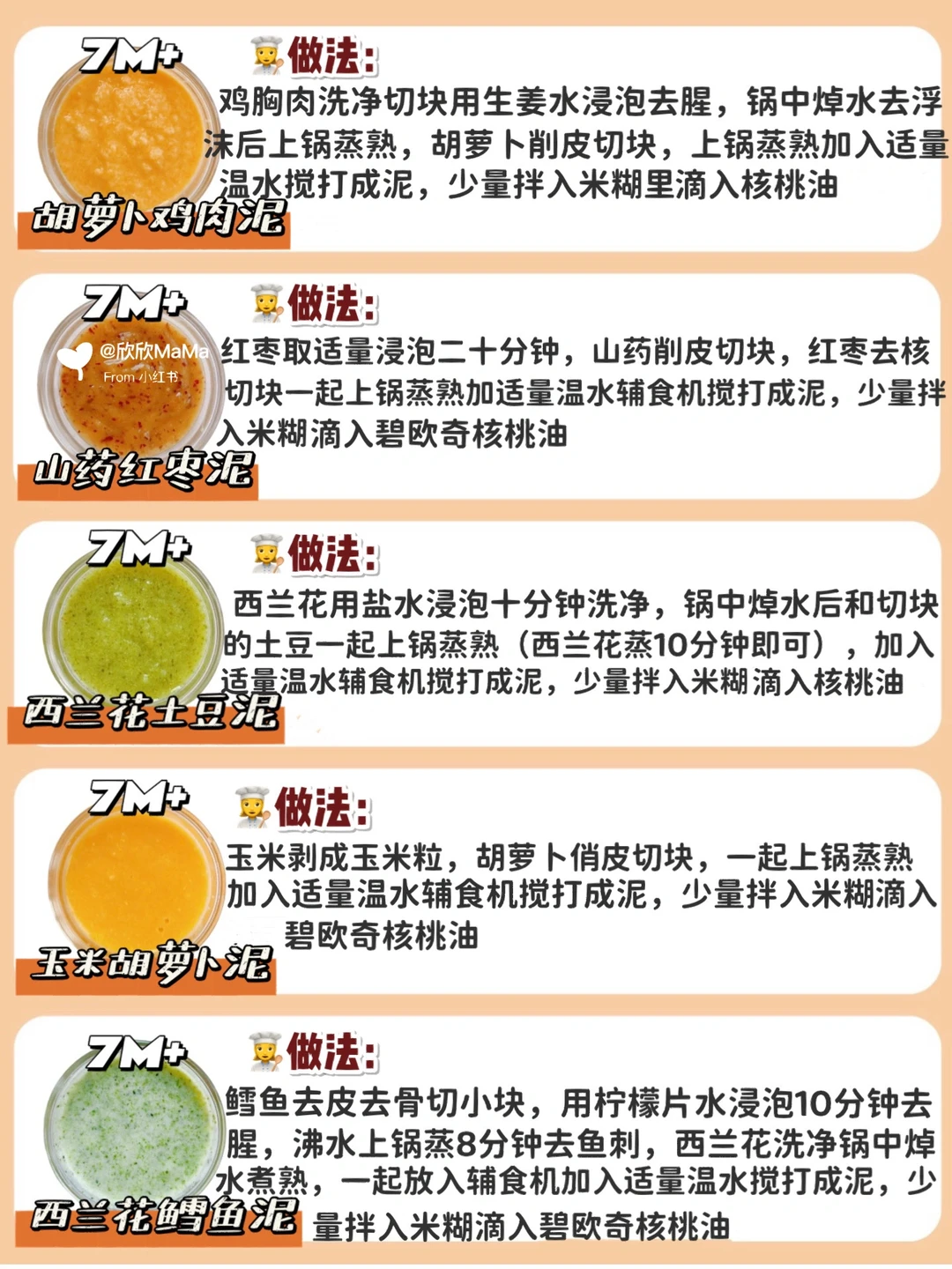 ⚠️ 每添加一种食材2-3天排敏期,如辅食泥第一天1-2勺,第2天2-3勺逐渐增加拌入米粉里滴入辅食油搅拌食用
