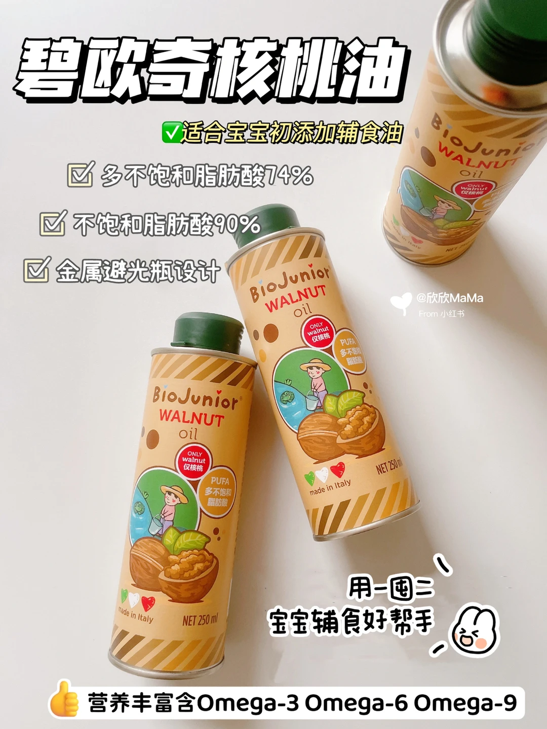🧡辅食油我入的是碧欧奇核桃油,油脂纯净没有杂质,淡淡的核桃清香,平时直接加入宝宝的辅食中,比如说米糊,粥,面条等、亚油酸及 Omega-3符合4-6:1黄金比例,作为初添加宝宝的辅食油很适合,在辅食中滴几滴,营养又健康~而且它是金属包装,能百分百完美避光,可以更好的保存保证营养的不流失,辅食油中的omega3、6非常畏光,容易发生光反应,产生有害物质,像这样的金属避光罐,妈妈们使用起来根本不用担心这个问题啦~