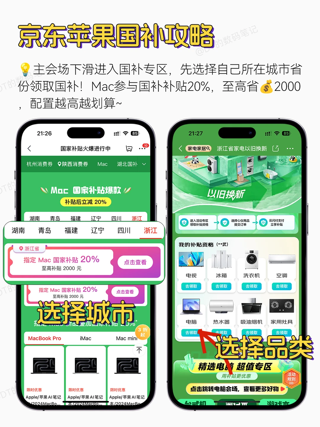 主会场下滑进入国补专区,先选择自己所在城市省份领取国补!Mac参与国补补贴20%,至高省💰2000,配置越高越划算~