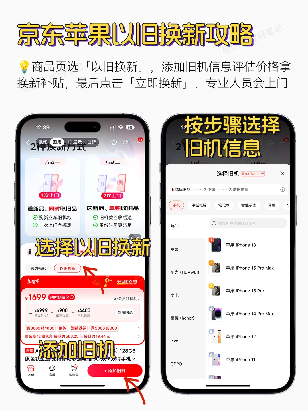 4️⃣要是有旧机换新,选好机型后,在商品页选「以旧换新」,添加旧机信息评估价格拿换新补贴500