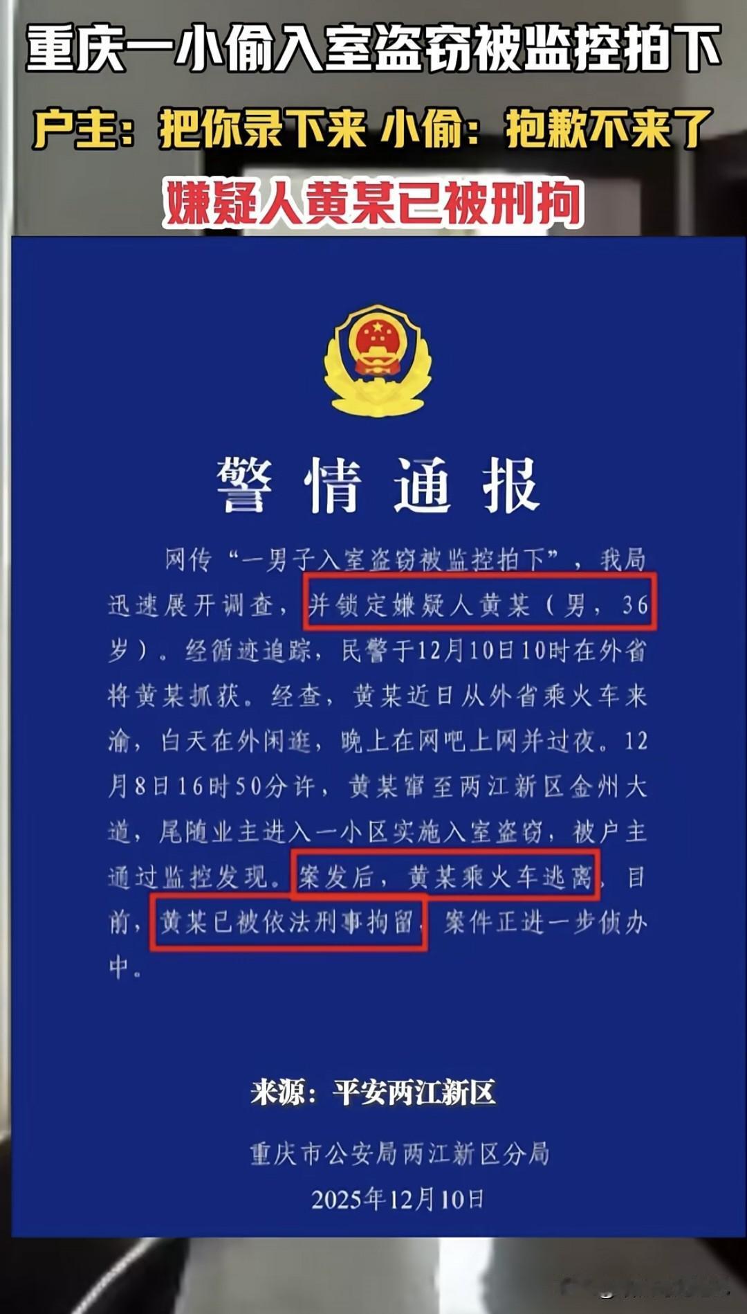 “是小偷啊?” “我把你录下来了!” “抱歉,我不来了~” 这对话像段子,却真实发生在重庆两江新区。户主手机里的监控 APP 弹出画面:陌生男子猫腰进门,下一秒四目相对,隔空社死。小偷秒怂,鞠躬三连,拔腿就跑,还顺手替主人关上了门,“礼貌”到让人哭笑不得。 黄某从外省坐火车来渝,白天踩点,晚上泡网吧,把“出差式盗窃”当副业; 作案后他连夜再坐火车溜号,结果 48 小时不到,就被警方跨省按头刑拘; 科技时代,监控+大数据让“飞贼”变“废贼”。流程被家用监控云端完整记录,直接做成“零口供”铁证。 但别只顾着吃瓜!黄某能尾随进小区,说明门禁成了“欢迎光临”;户主先以为是家人,才远程喊话,可见防区意识仍停留在“熟人社会”。技术升级了,我们的安全习惯也得同步更新——门口加一枚电子猫眼,录像云端双备份,快递用化名,异常先报警。 一句“抱歉”换不来原谅,换来的是七日“银手镯”体验卡。黄某的下一站是看守所,而我们的下一站,是把安全感从“别人给”改成“自己造”。 「图源:网络」
