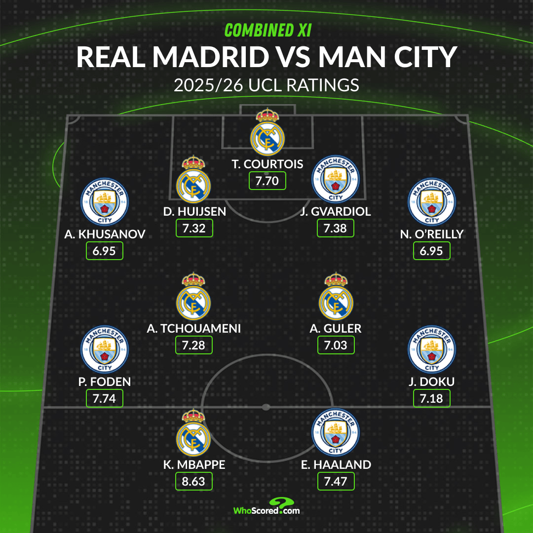 虎扑12月10日讯本轮欧冠焦点战,皇马主场对阵曼城。赛前WhoScored盘点本赛季欧冠两队合体评分最高阵容: