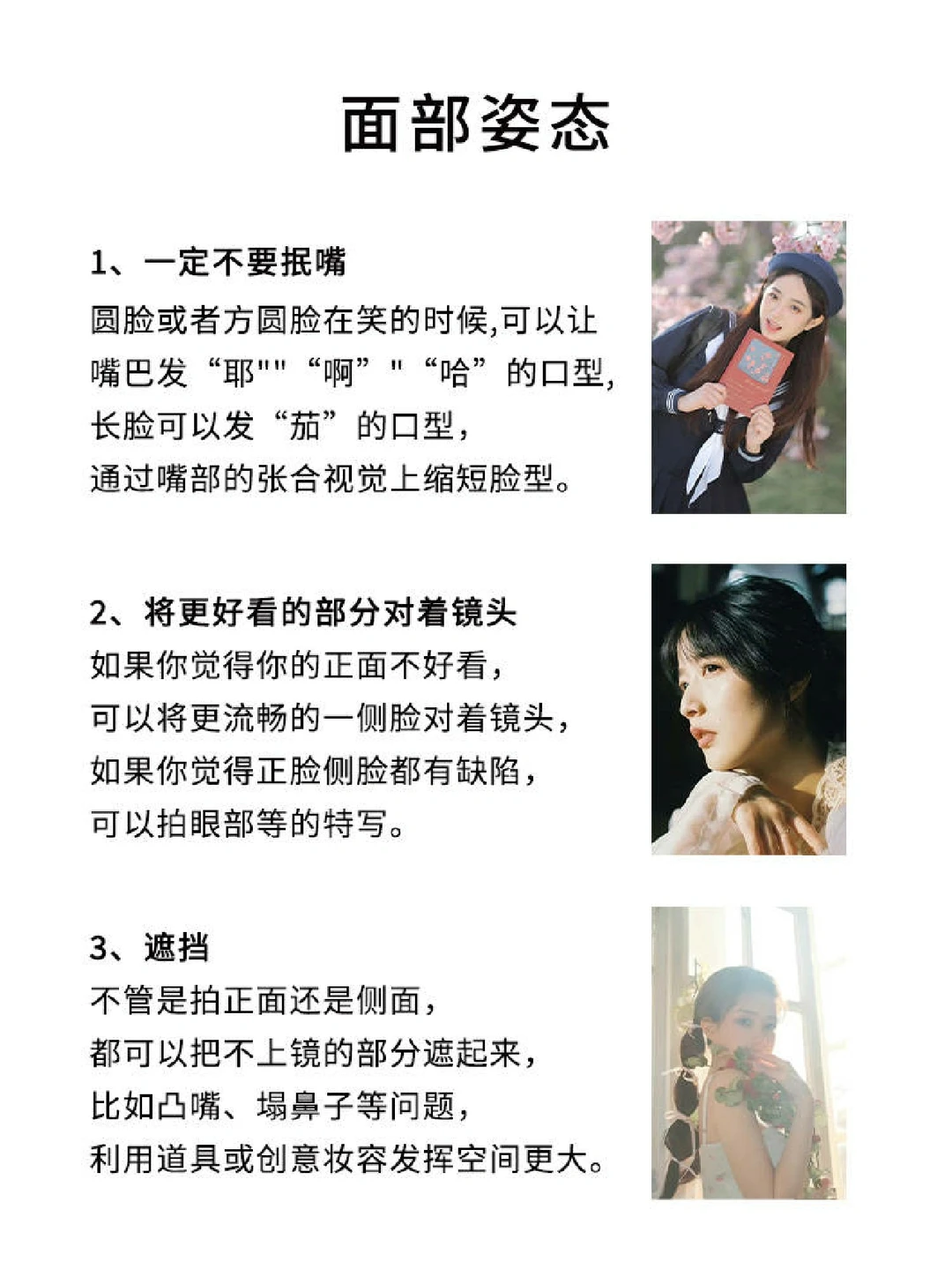 一些面部的缺陷可以通过妆造弥补,也可以通过摆动作、运用道具来遮挡或者弱化,甚至摄影师的构图、打光、后期都可以起到作用。