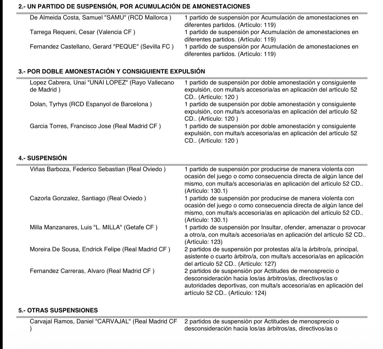 虎扑12月11日讯西班牙足协纪律委员会公布了上轮西甲中新增的停赛情况。