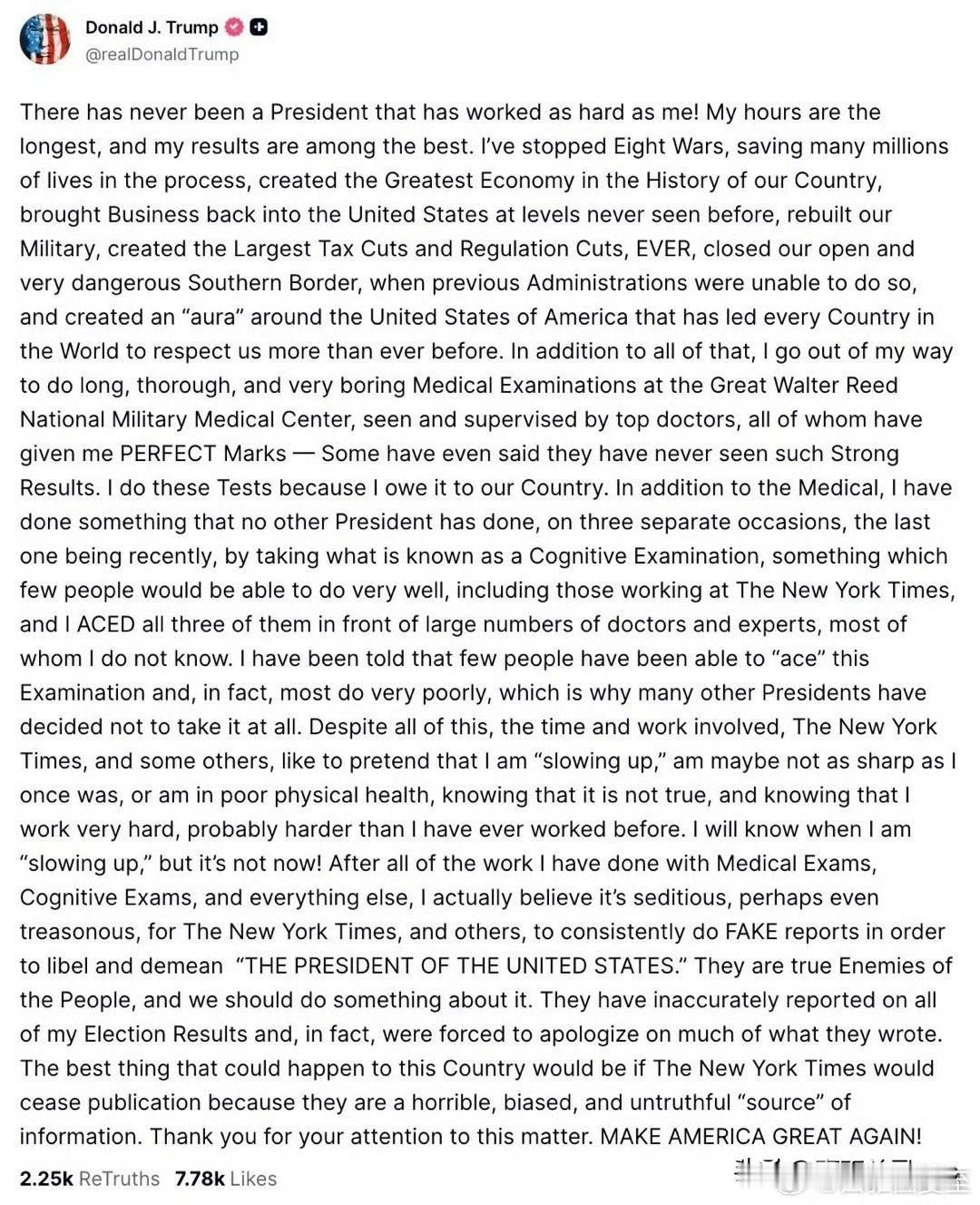 美国总统特朗普发长文:身体非常健康、工作非常努力,质疑总统的健康状况是叛国 ​​​。 2025年10月的体检确实非常好,各项指标正常,医生的结论是身体健康状况很好。 但最近一直有舆论质疑他的健康状况,其动机不言自明。 他发文回应道,我刚做了体检,全A,我还做了非常难的认知测试,也是满分,里面的题目你们这些假新闻记者99%答不出来;特朗普头脑非常清醒,不清醒的是你们! 我每天要开四场新闻发布会,居然有人发文质疑“特朗普身体健康吗?”你们简直疯了! 据他的同僚透露,特朗普精力超级旺盛,以至于团队成员都跟不上,陪不下来。