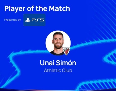 本场比赛毕尔巴鄂竞技门将乌奈·西蒙发挥出色,全场贡献4次扑救,帮助球队完成零封,赛后当选欧冠官方评选出的本场最佳球员。