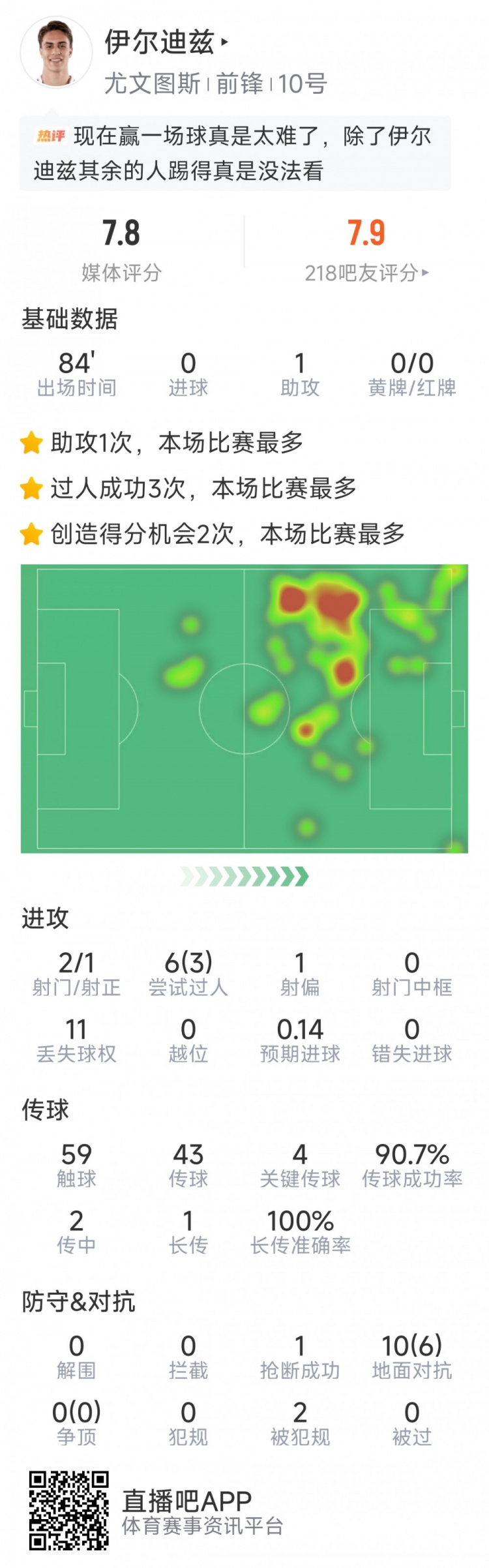 直播吧12月11日讯在本轮欧冠,尤文2-0击败帕福斯。以下为伊尔迪兹本场数据:
