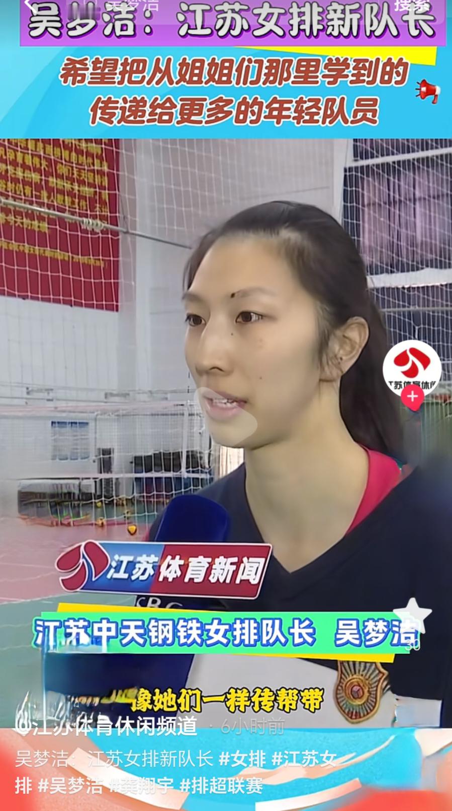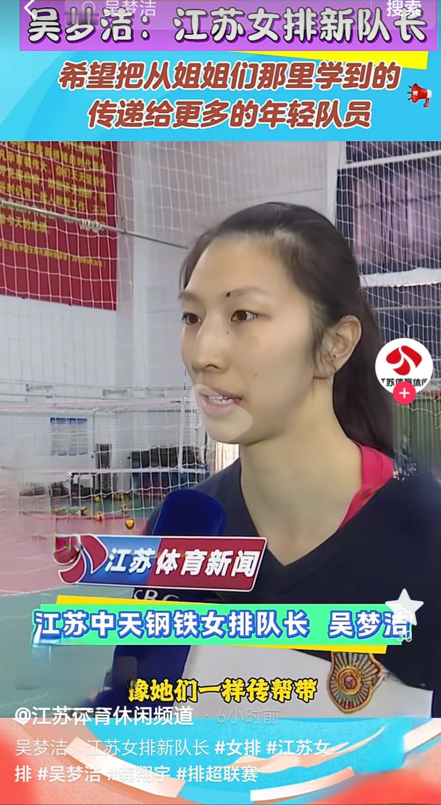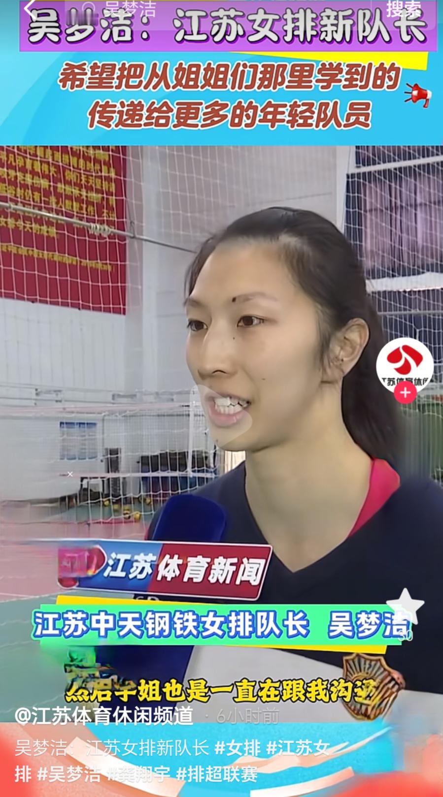 中国排球超级联赛 随着龚翔宇留洋美国,江苏女排队长这一职位也出现了变化,接力棒传到了吴梦洁的手上。近日,新任江苏中天钢铁女排队长吴梦洁接受了江苏体育休闲频道记者的专访。吴梦洁表示:“希望”把从姐姐们那里学到的宝贵经验传递给更多的年轻队员”。即将开始的新赛季排超联赛将是吴梦洁就任队长后的首秀。小吴梦洁加油!图源:江苏体育休闲频道