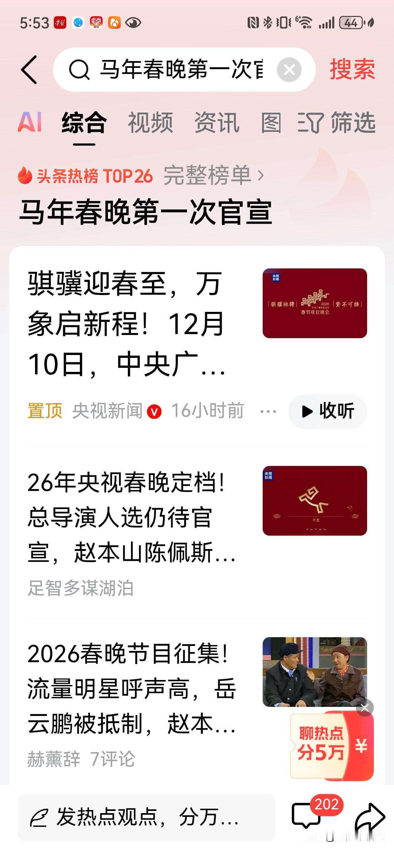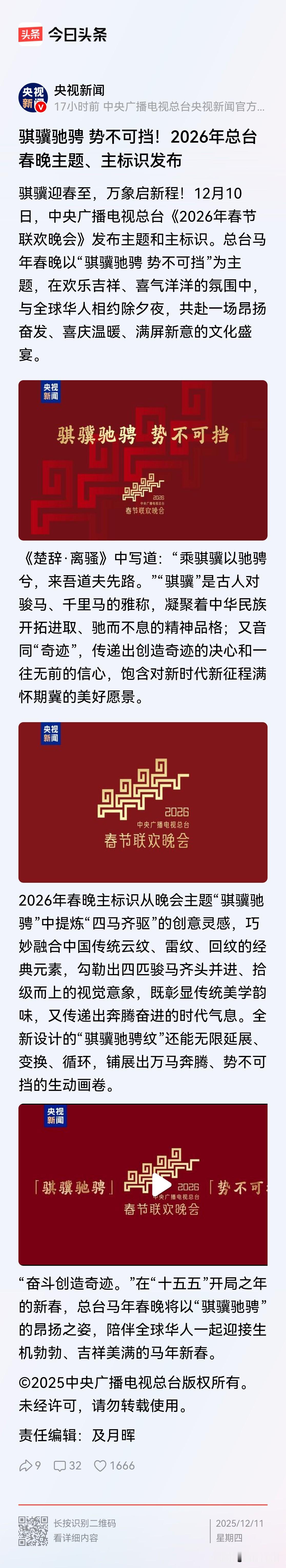 央视春晚主题主标识发布,但老百姓更想问一句:今年的春晚,能让我们找回围炉守岁的真心笑颜吗? 我们怀念的春晚,是陈佩斯一碗面条撑起满堂喝彩,是赵丽蓉一句“探戈就是趟啊趟着走”烙进几代人的记忆。没有悬浮人设,不靠流量硬凑,有的只是专业演员把生活嚼碎了、演透了的本事。那份热闹,是从市井烟火里长出来的,真切、扎实。 如今科技炫了,舞台大了,可那份全家屏息等待的“年味”却淡了。我们不要假唱垫音,不要网红挤占专业舞台,更拒绝矫揉造作的表演污染除夕的客厅。春晚是百姓的晚会,不是流量的秀场。 2026马年将启。愿总台真如骐骥,踏碎浮华,直奔人心。让专业的人回归专业的舞台,让真诚的创作照亮团圆之夜——这,才是真正“势不可挡”的春晚。 对于马年春晚,欢迎评论区留言讨论。马年春晚 春晚主题标识